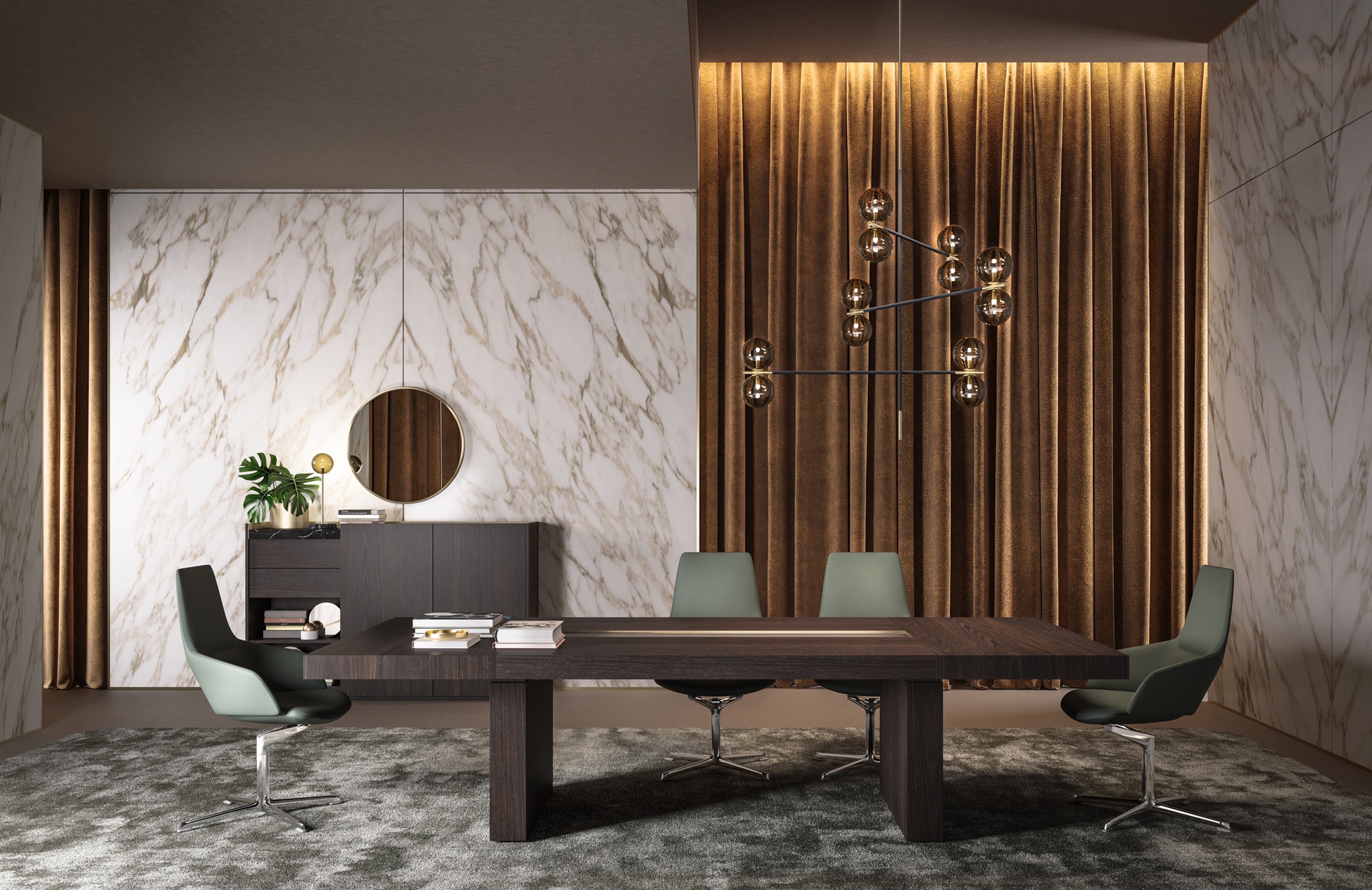 So why not bring the trendy materials that are mostly seen in our homes, into the office. For example, using marble, adding copper and gold details, using velvet, strong colors in accent walls and exciting forms of lighting. This is all for creating accents in the office and personalizing the rooms.