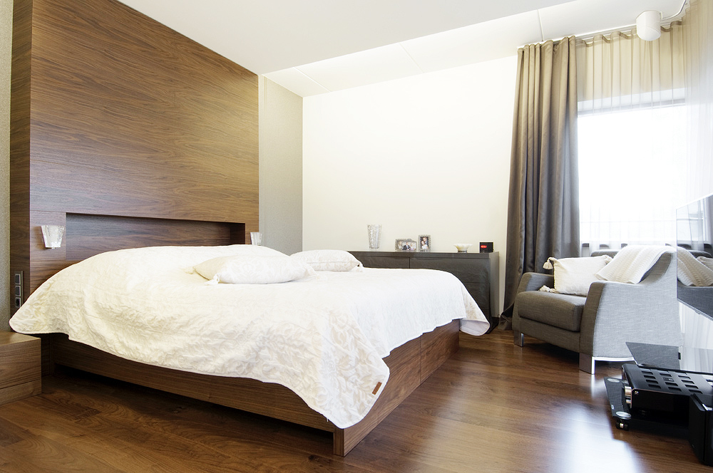 The second floor of the households three bedrooms, a walk-in wardrobe and a bathroom. As a great collaboration between the architect and the interior designer, a convenient shaft connects the second-floor bathroom and the first-floor utility room so all the laundry can be just thrown down the shaft.