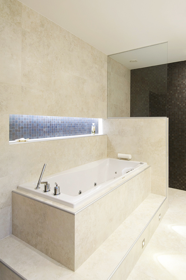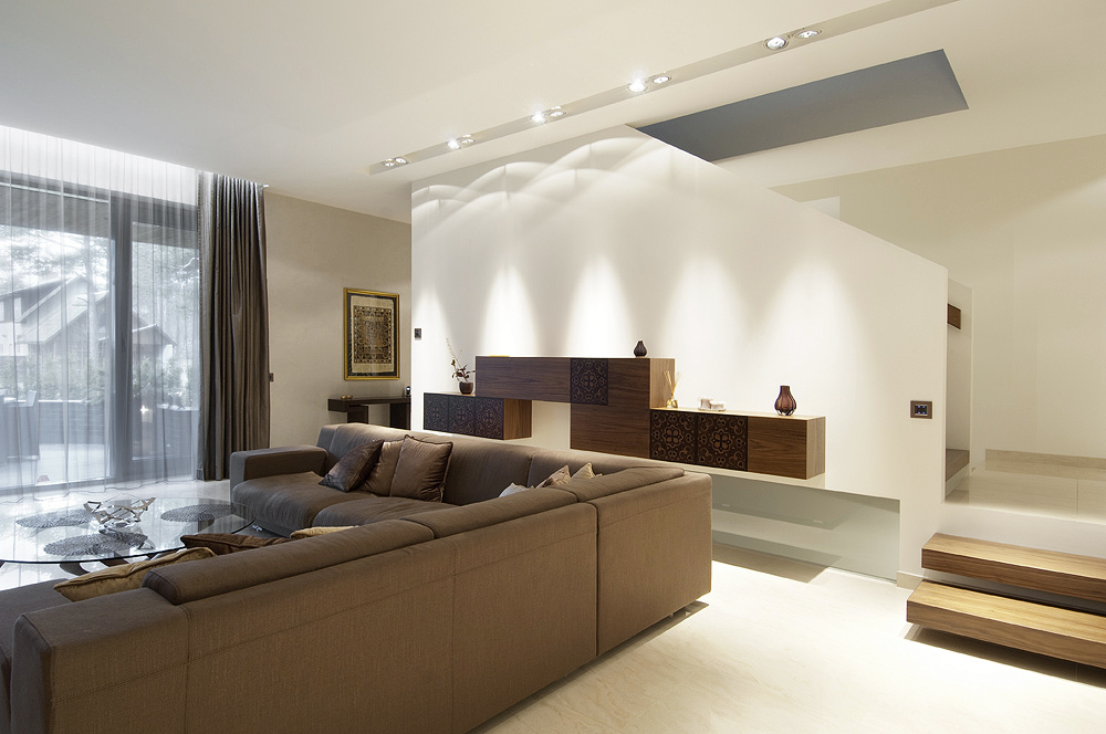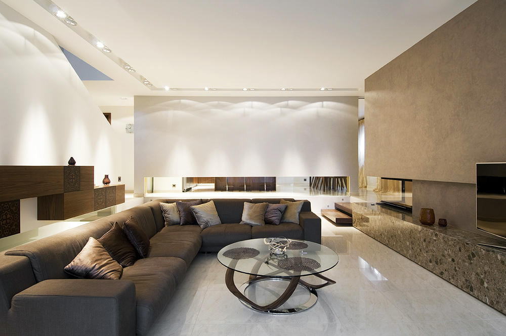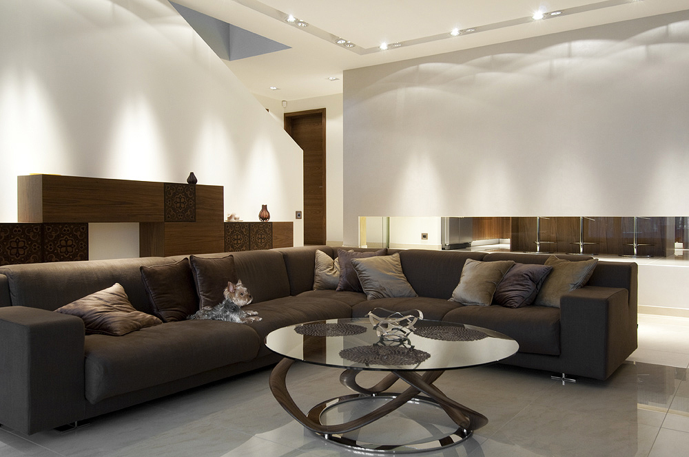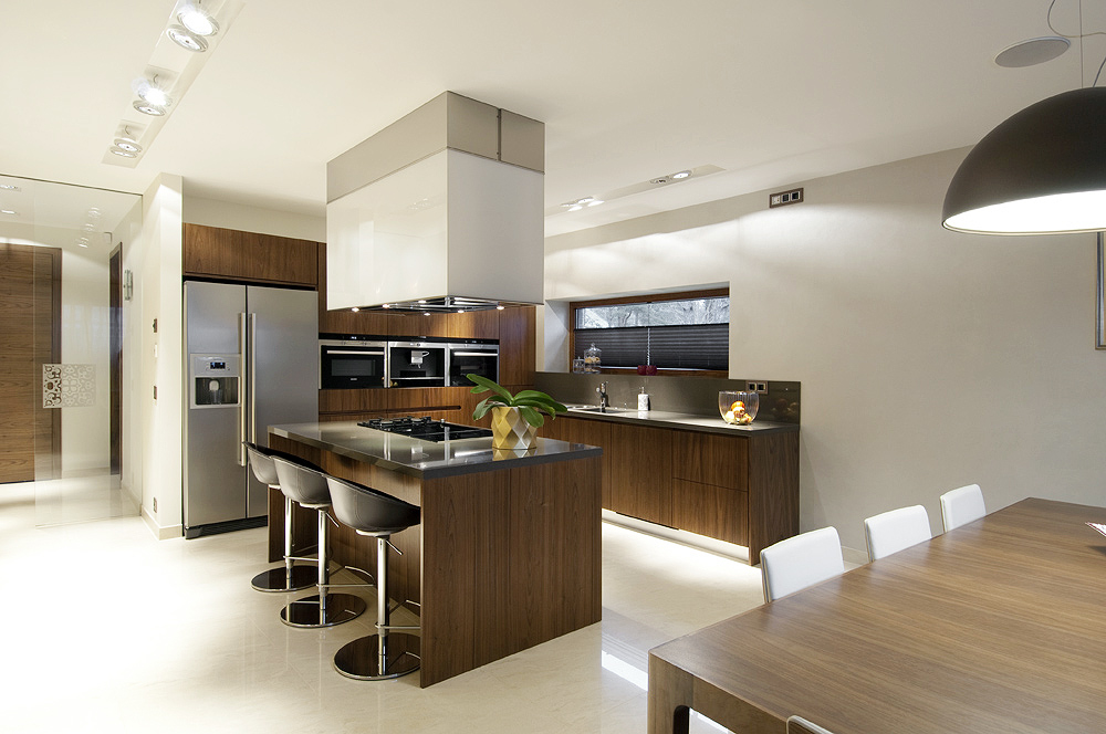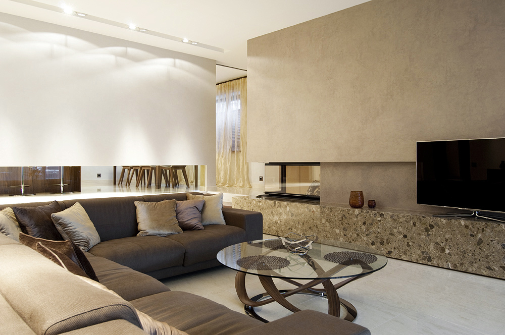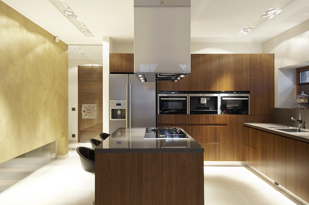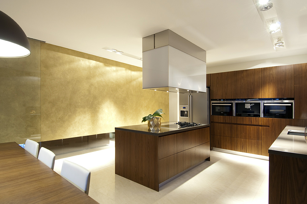 As per the clients’ wishes, all the materials were of the finest quality. The central colour scheme was warm hazelnut contrasted by stone, glass and fabrics. We also used decorative colours to make it homier and painted an accent wall in the kitchen gold.