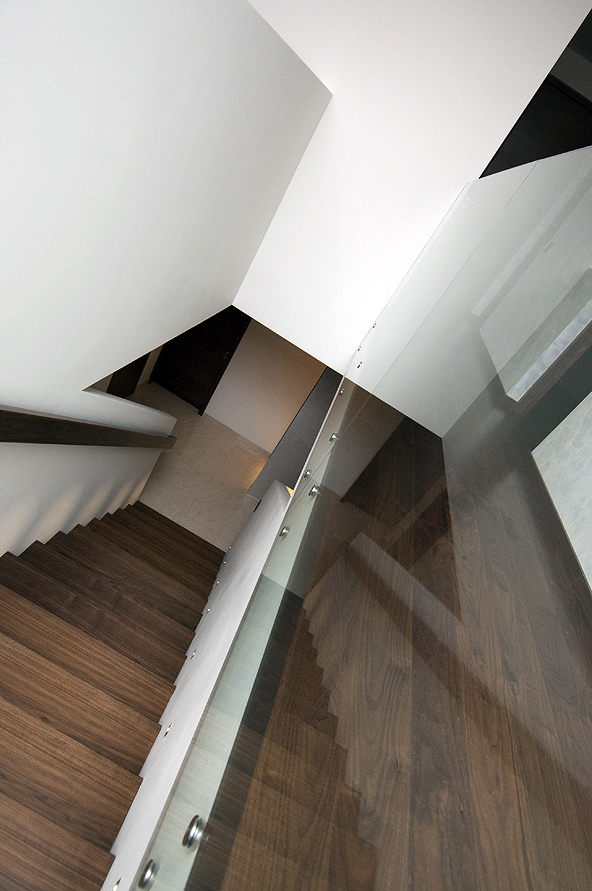 The goal was to keep the connecting stairs between two floors as unnoticeable as possible so it wouldn’t disrupt comfort of living room lounging. We found the solution in a stair hall. Meaning the stairs would be covered on both sides with partitions. To add air and excitement we put in windows.
