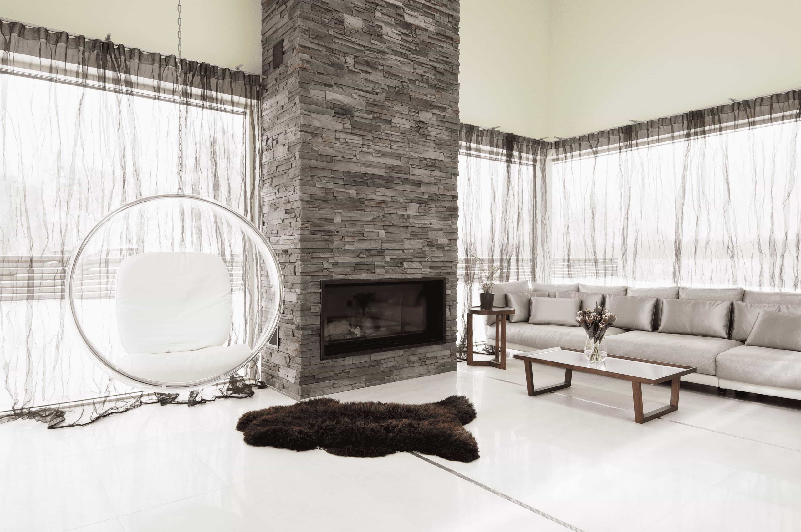 The focal point of the living room is a fireplace covered in natural stone. A chair hanging rom the ceiling and a fun cheese lamp bring a playful twist to the room.