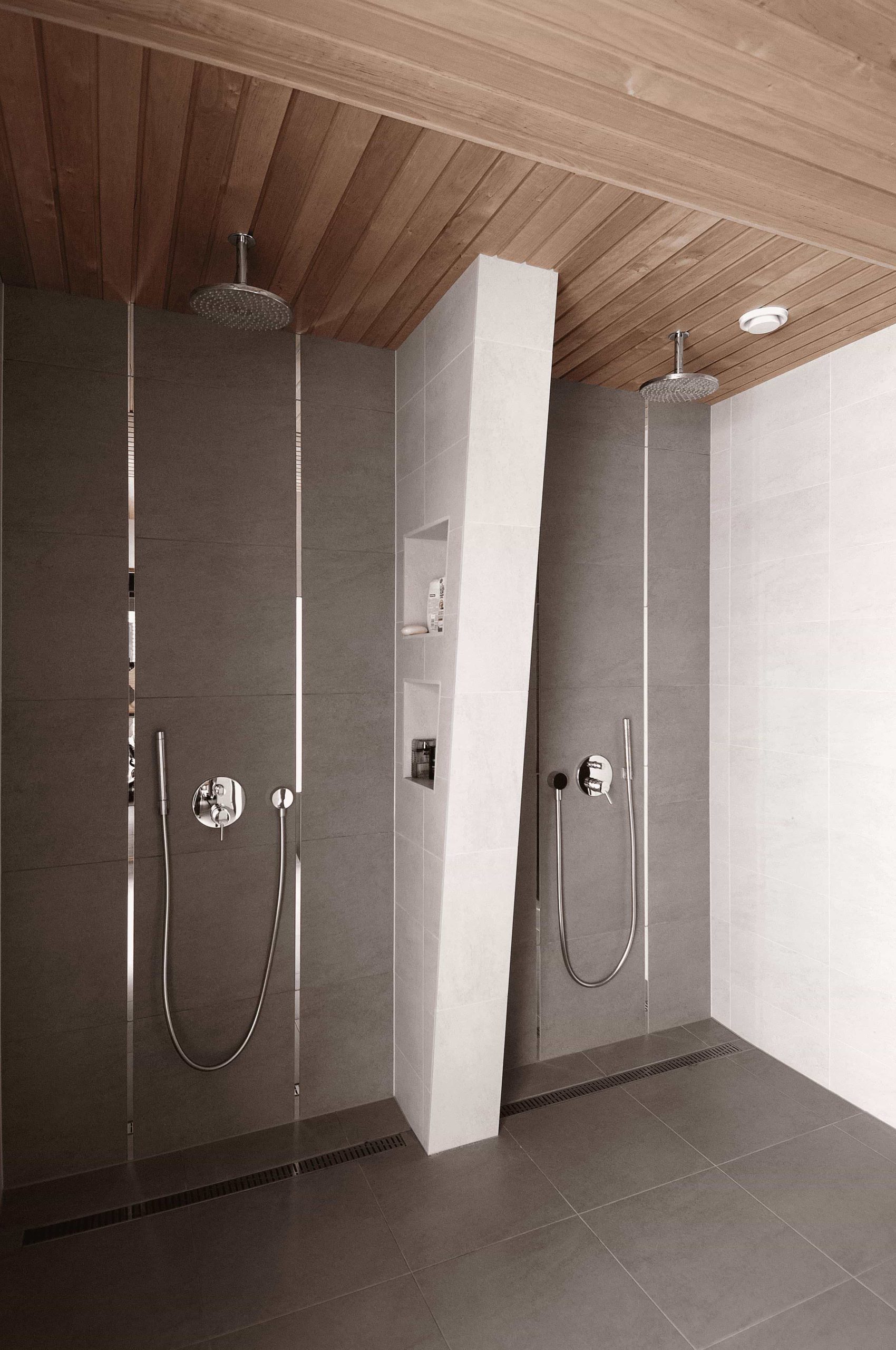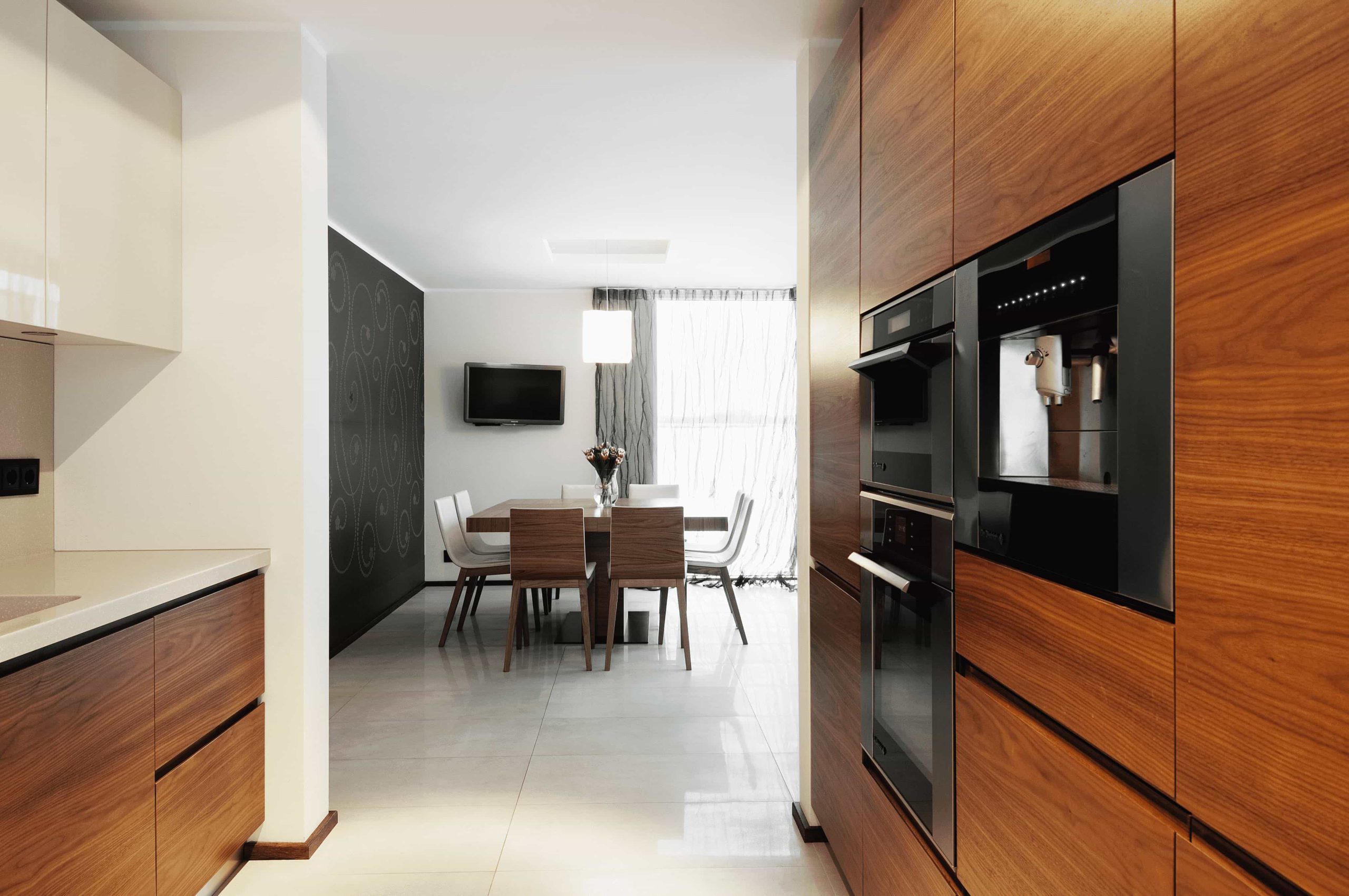 On the first floor there is a sauna, a utility room and a light living room with an open kitchen and a dining room area. The whole of first floor is laid with porcelain tiles. To contrast the glossy white floor, throughout the whole floor there is walnut-veneer furniture to incorporate warmth into the room.