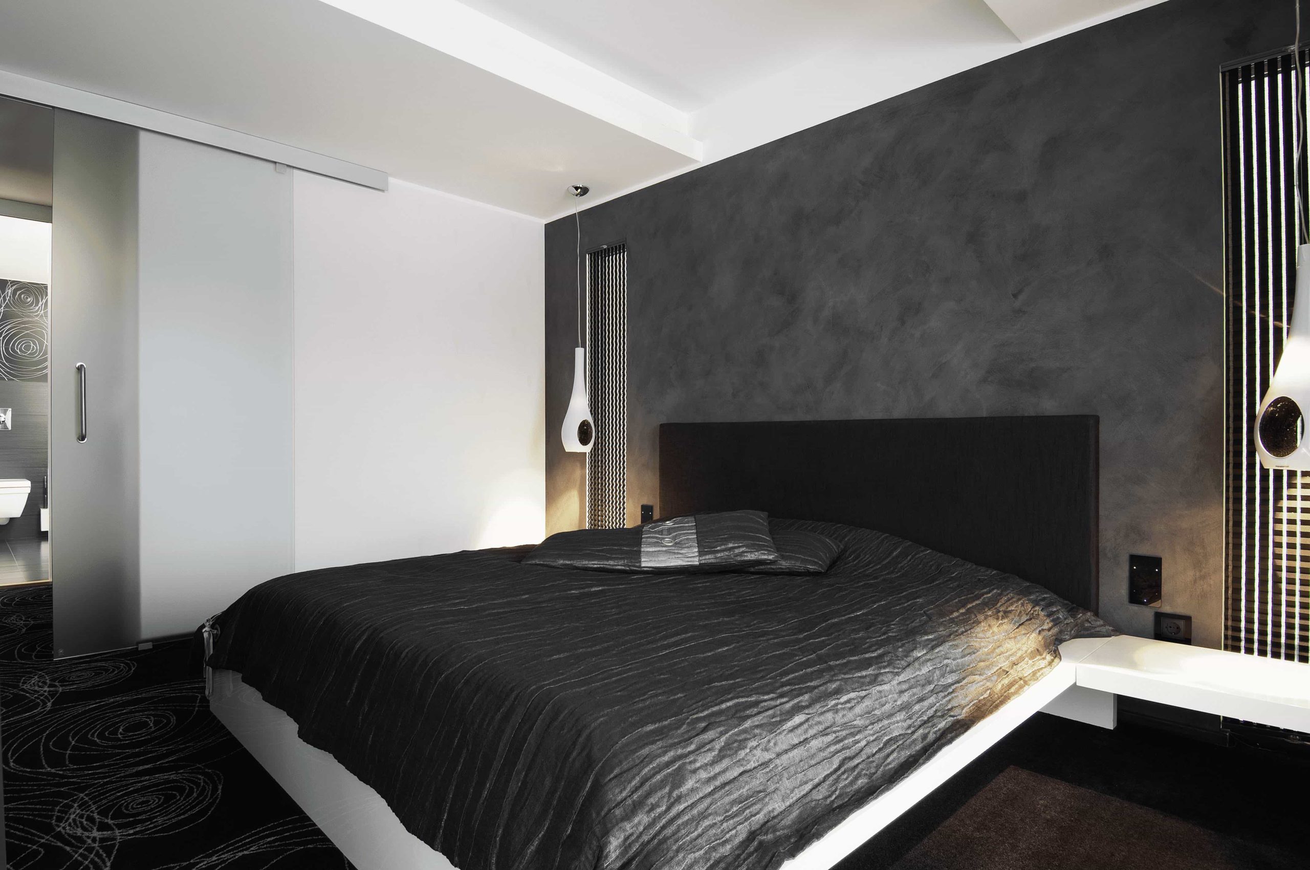 The family’s bedrooms are located on the second floor. Mom and dad’d bedroom is decorated in silvery gray colors. There’s also a direct way to the walk-in closet and the bathroom.