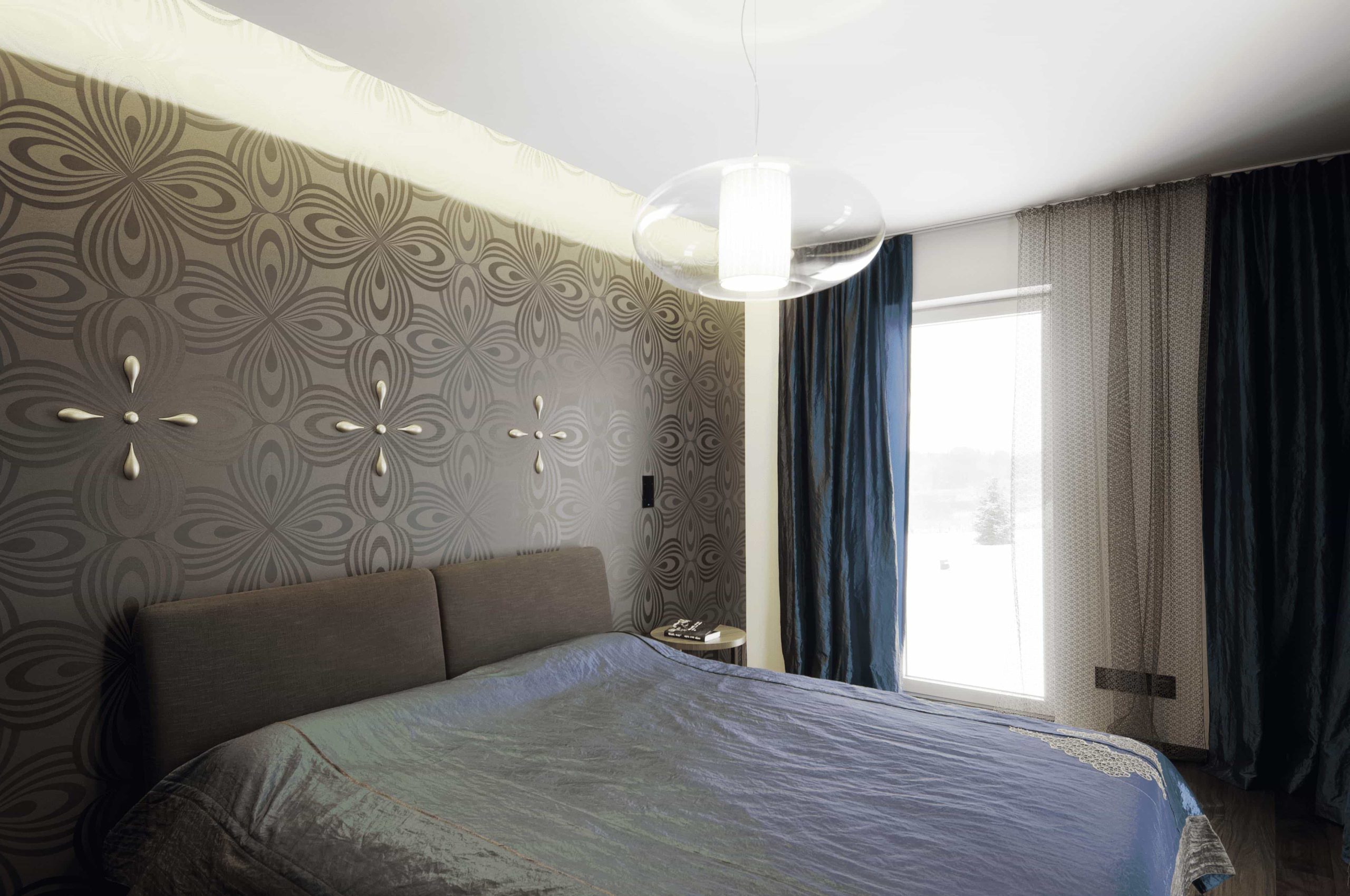 In a guest bedroom a brown-hued Luigi Colani designer wallpaper is hanging on the walls. Its interesting details create quite the view at the head of the bed. The baby’s room is also on the second floor. The goal was to create a happy, light-filled, yet cozy room for the baby. After a long search we found the furniture from England. In this room as well as the others, Pärnu’s very own curtain designer Varje Kuures’s curtains and bedspreads bring warmt to the rooms.