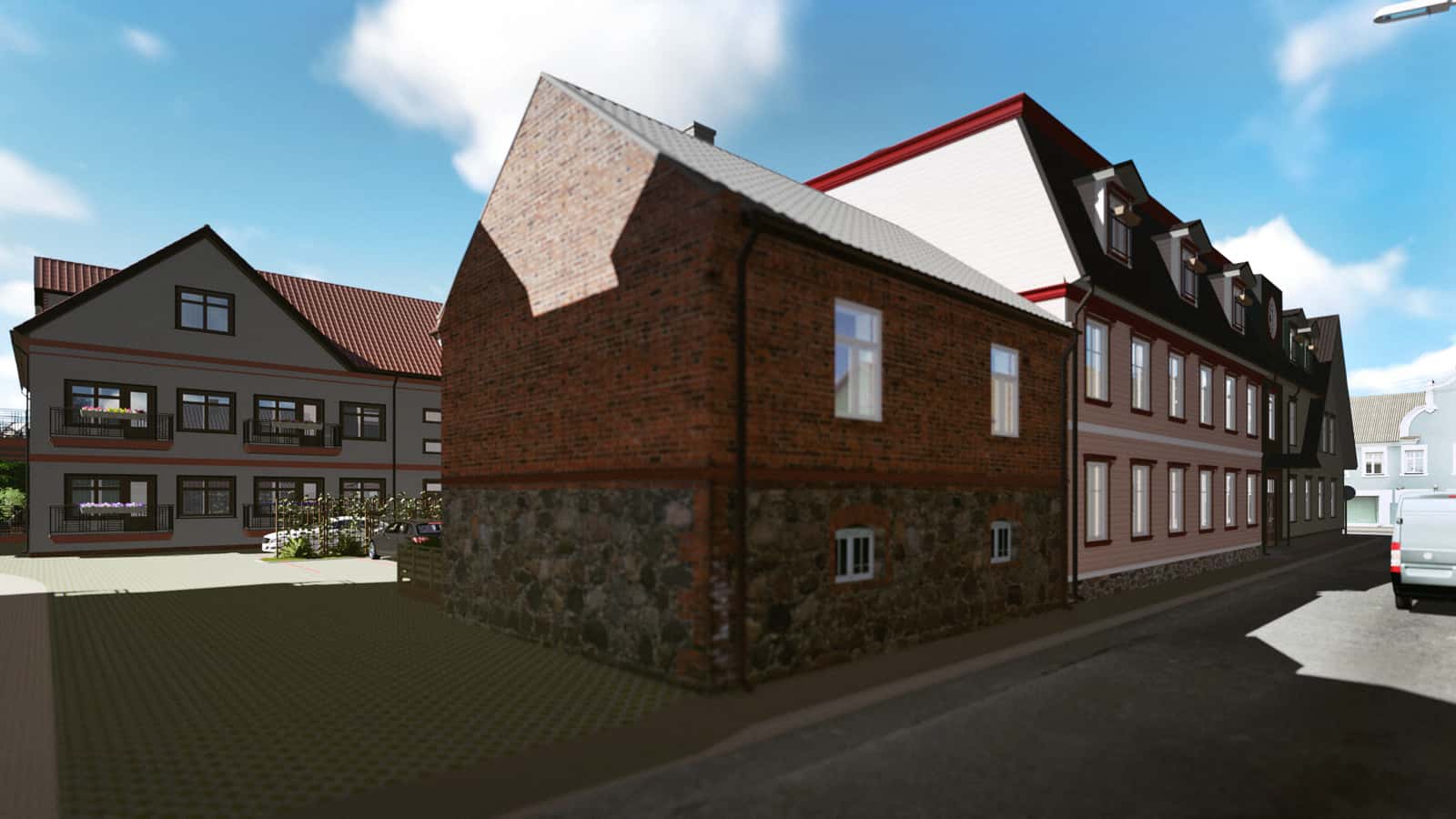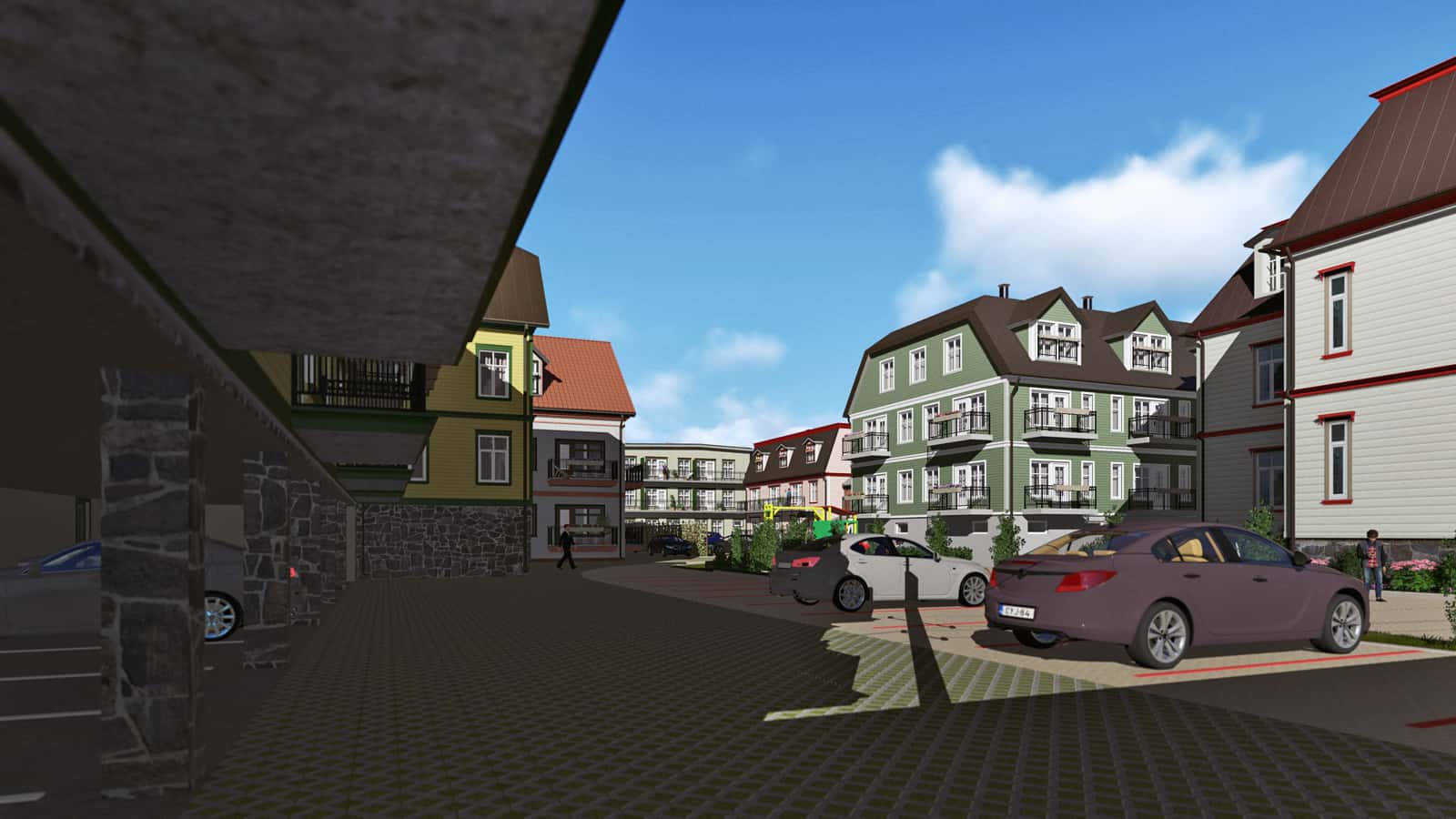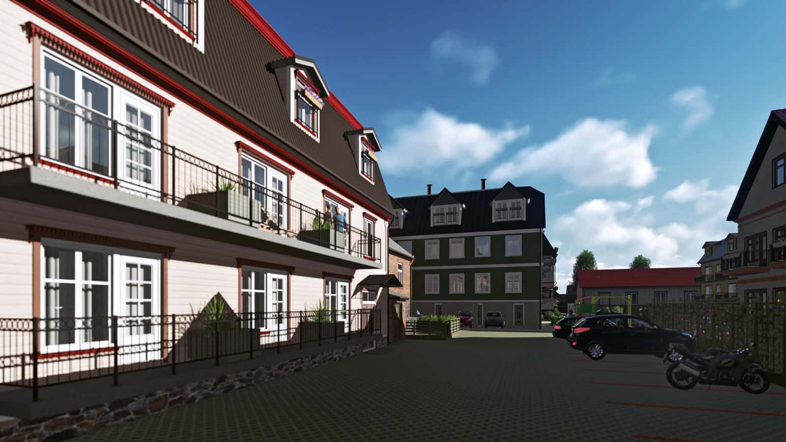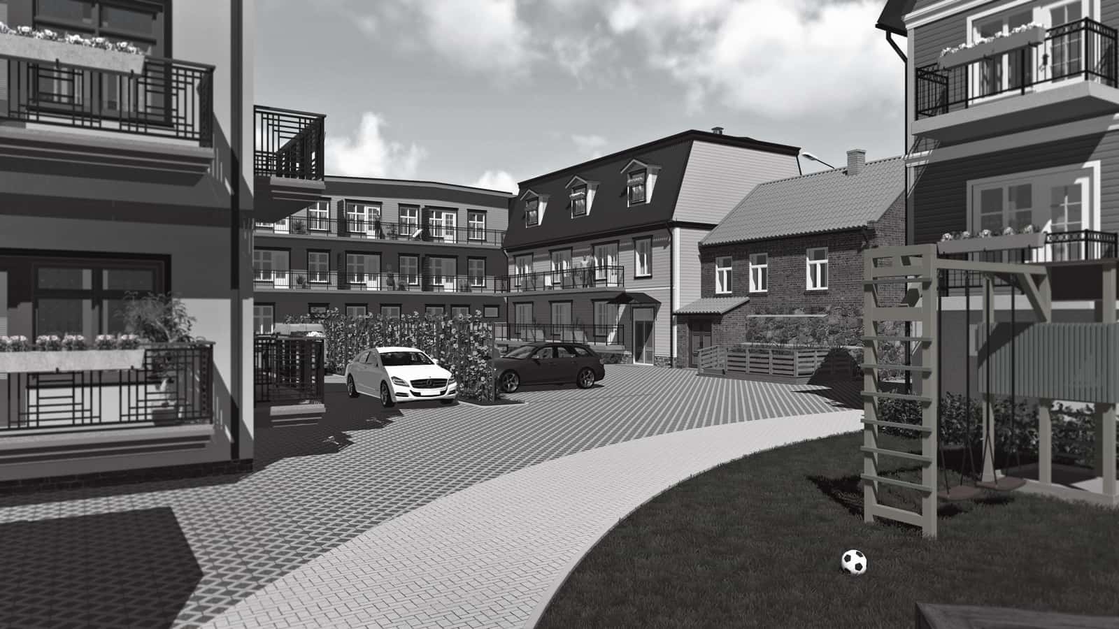Our assignment was to create the 3D drawings and a video presentation on the basis of architect’s black-and-white sketches and one existing ready-made house. The drawings were not fully completed yet. Many ideas from the real estate developer and the architect were to be recreated with the software based on information from blitz meetings and phone calls. All this made the task bit more complicated. Finally, together we reached the initial goal and obtained a building permit from the city.Today, you can enjoy this pleasant and quiet quarter when walking from the Old market towards the Pärnu river bank. We appreciate the opportunity to give our part in making Pärnu more beautiful place to live.