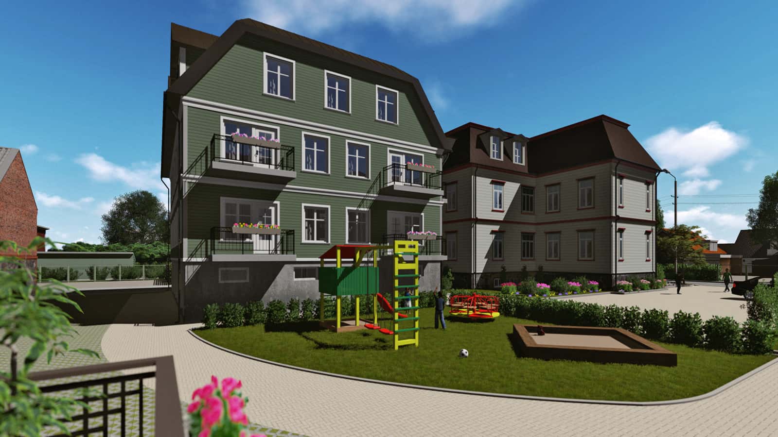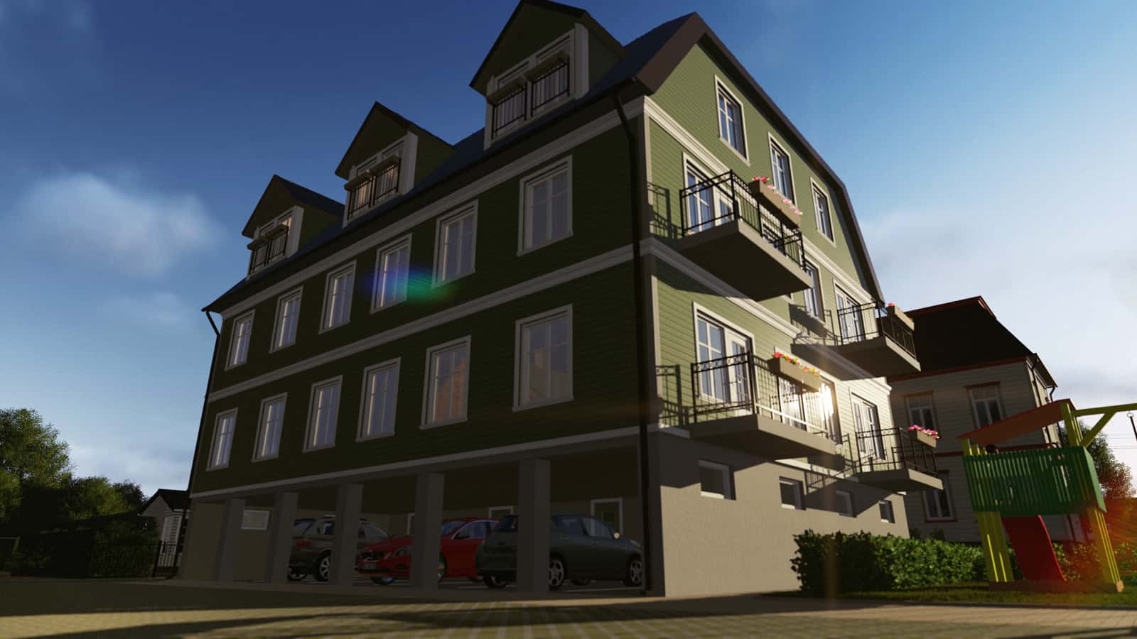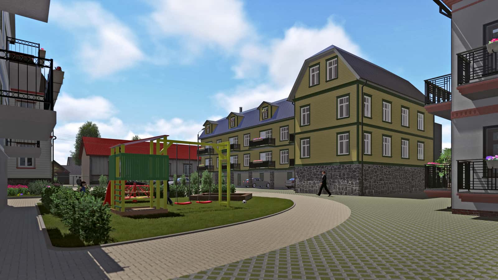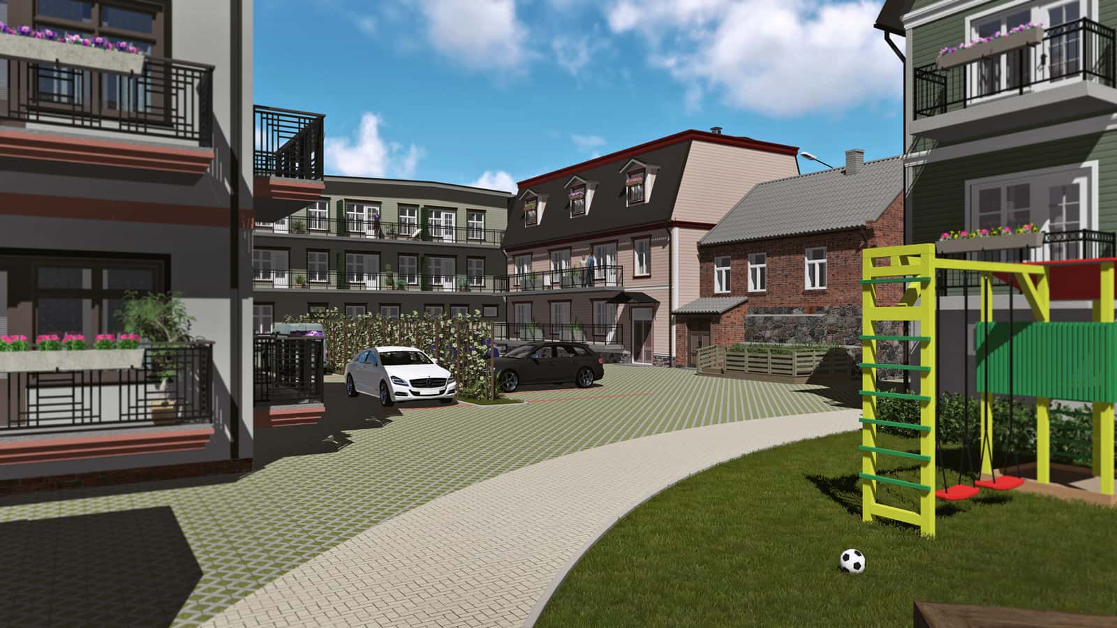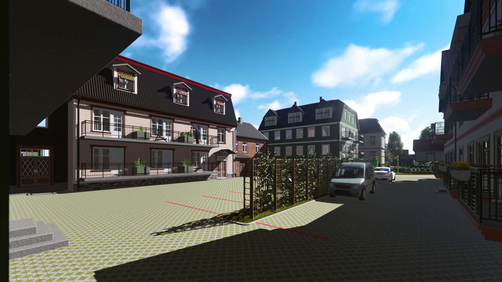 This property was comprised of a number of houses of varying size and style, which made the task more complex in construction terms. To create a modern quarter in the heart of the city, it was planned to use existing garage constructions to build open car shelters. The children’s playhouses and green areas for the whole quarter were also designed by our team.