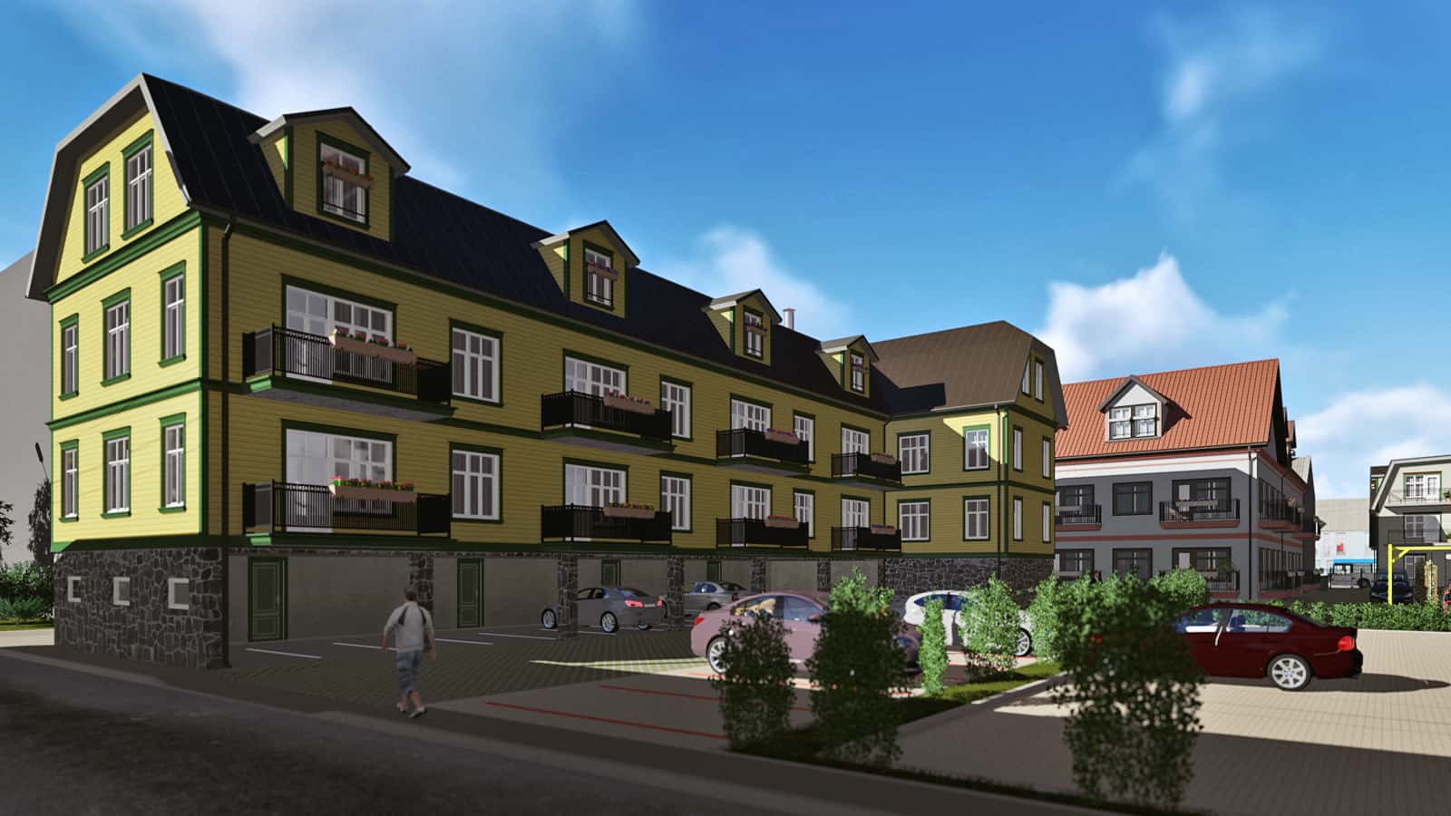 In the center of Pärnu, right behind the freshly renovated Riia mnt 27 traditional wooden building, a residential block of five apartment buildings was planned. The original idea for a long-standing, decomposing house renewal project was created by real estate developer Tõnu Korts.