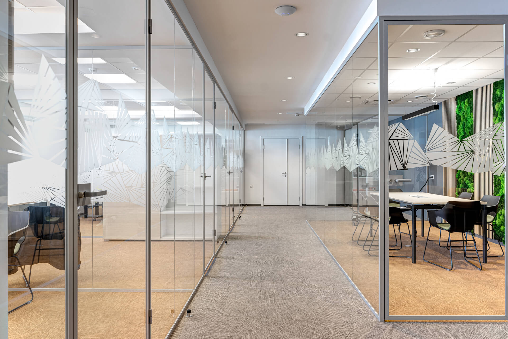 Since the client wanted to bring the theme of nature from the outside into the room, we alternated moss panels with acoustic strip panels in the gallery and small meeting room. We also added nature motifs to all the renovated toilets.