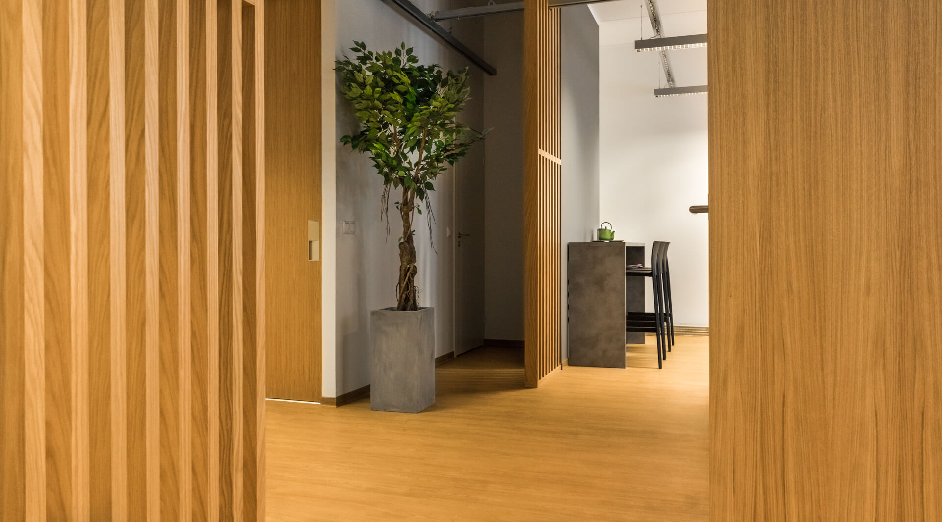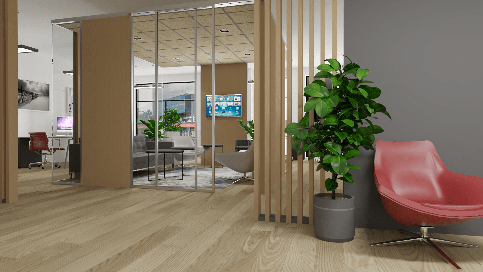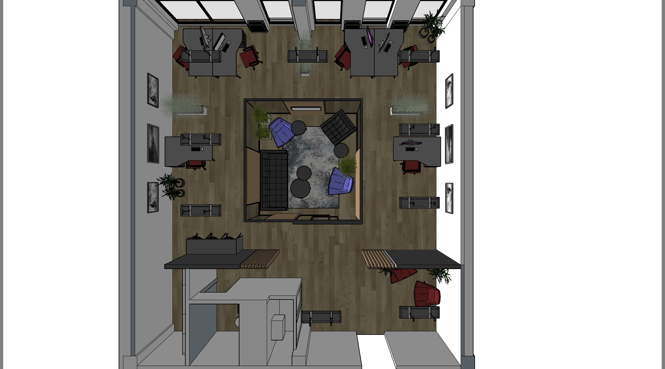 When entering the room from an outdoor corridor, the first place is the reception area. There is a small seating area and a wardrobe, which we drew to integrate with the toilets wall extentions. To separate workplaces and the reception area, we added a ribbon wall that allows people working right behind the wall do it privately, while leaving the room open.