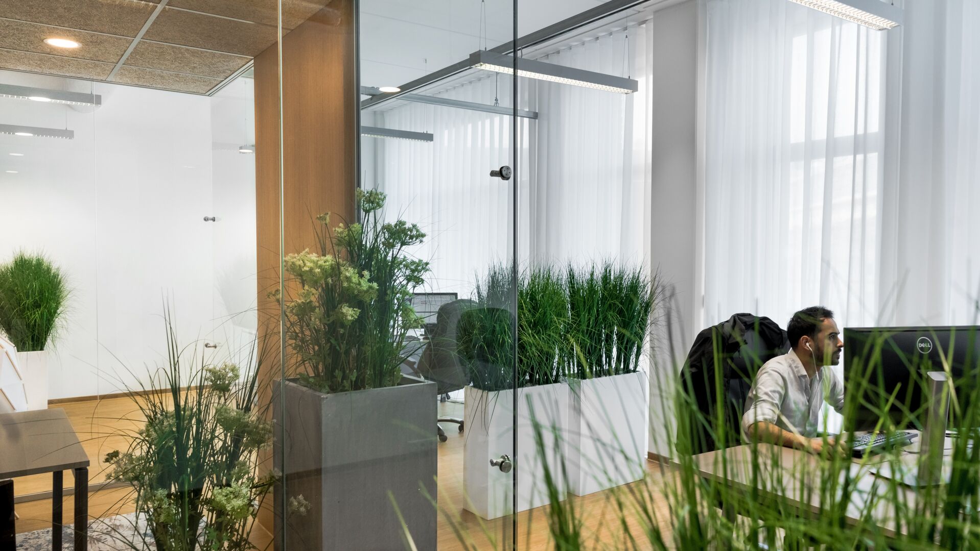 Despite the fact that the office where only the development team works and customers rarely visit, we planned a meeting room in the center of the office. This is necessary in order for people to get up from the desk and to look at things together. They can also use this space to work in a free format or just relax from sitting behind the desk. The meeting room partition walls are custom-made in cooperation with local manufacturers. The materials used for this are glass, some parts of the wall are veneered. We also lowered the ceiling and created a suspended from the fiber boards. From the interior and the furniture side we left the room simple but cozy by designing some sofas, plants and carpets, which the customer wanted to look for and acquire on their own.