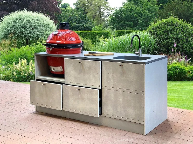 FRONCRETE aastaringselt nauditav väliköök. Kompaktse väliköögid, mille kergbetoonist fassaad ja küljed on lisaks ilule ka kerged, vee-, kriimu- ja ilmastikukindlad ning lihtsad hooldada.