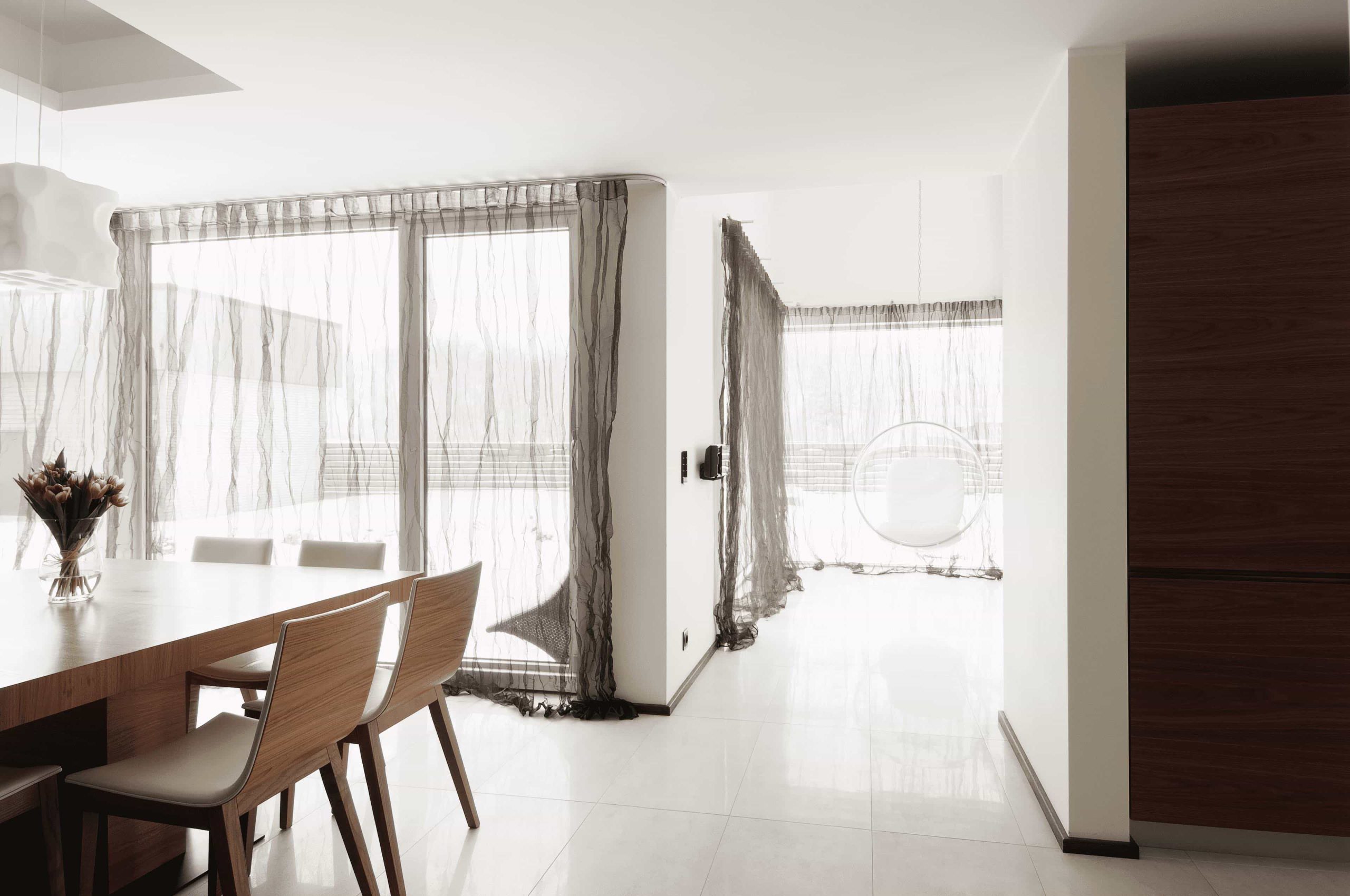 Kogu esimese korruse põrand on kaetud valge täismass-keraamilise plaadiga. Vastukaaluks läikivvalgele põrandale läbib kogu korrust pähklispoonist mööbel, mis annab valgele ruumile juurde vajalikku hubasust ning soojust.