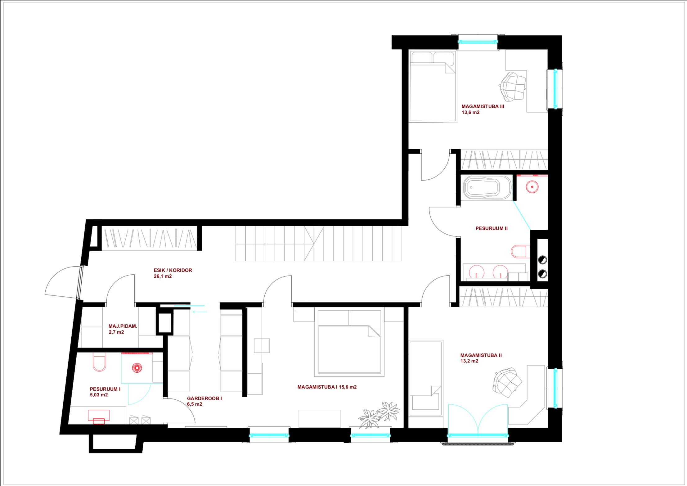 Uues põhiplaanis asuvad esimesel korrusel pere privaatsemad ruumid nagu magamistoad, garderoob ja vannitoad. Samale korrusele kavandati ka majapidamisruum, kuhu paigutati helikindla ukse taha pesumasinad, kesktolmuimeja süsteem ja teised tehnilised seadmed. Teisele korrusele liigutasime varem all korrusel olnud elutoa ja köögi.