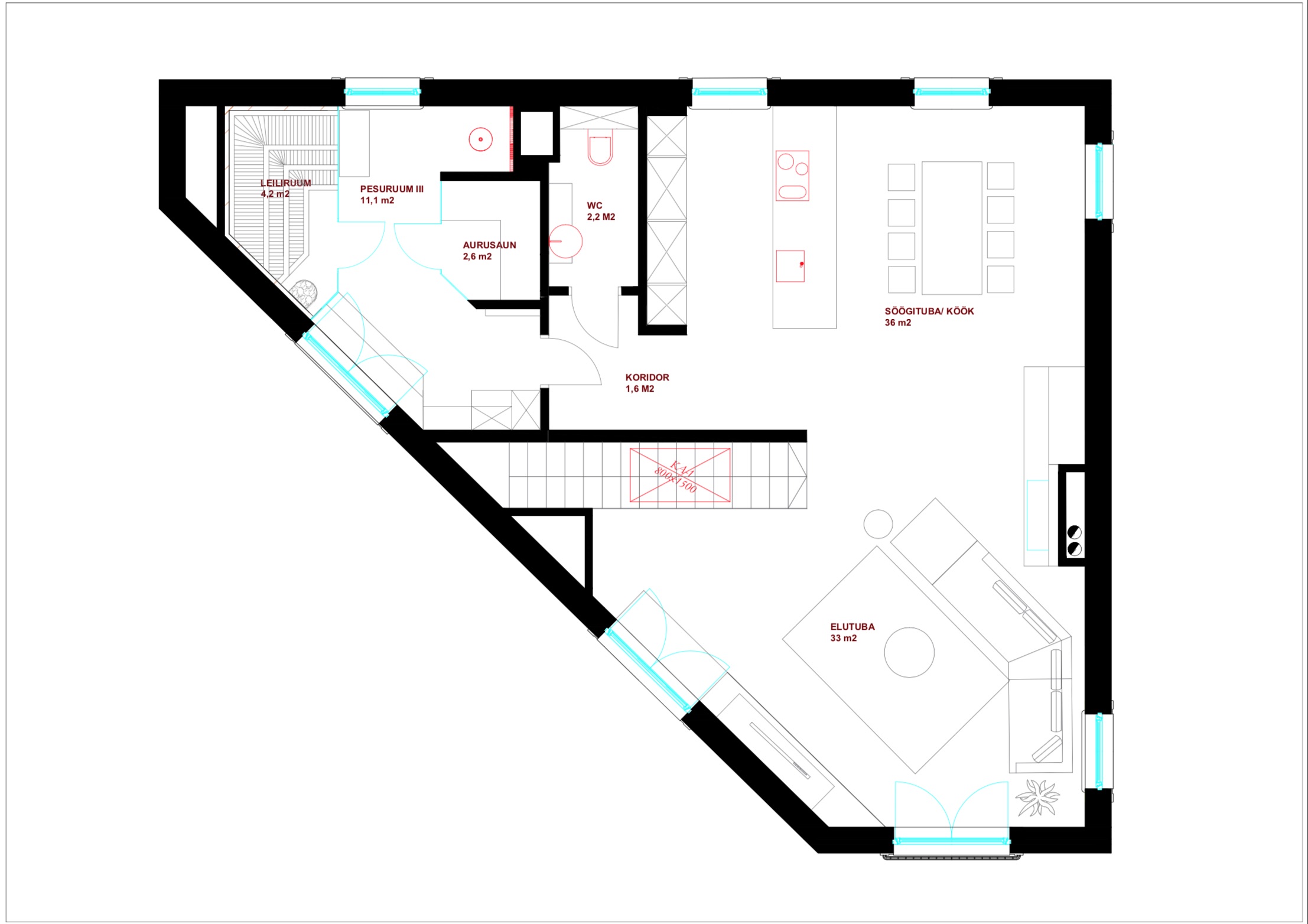 Köögikapide uste viimistluseks on valitud nanotehnoloogi must Fenix laminaat, köögisaare tööpinnaks valge komposiitkivi (Corian). Ruumi on köögis mõnusalt palju ja köögisaare ümber mahuvad appi toitu valmistama ka külalised. Pidulikumatel puhkudel istutakse aga pika söögilaua taha, mille äärde valiti Cattelan Italia nahast polstriga toolid. Suured aknad täidavad kogu ruumi valguse ning helge ja päikeselise õhustikuga.
