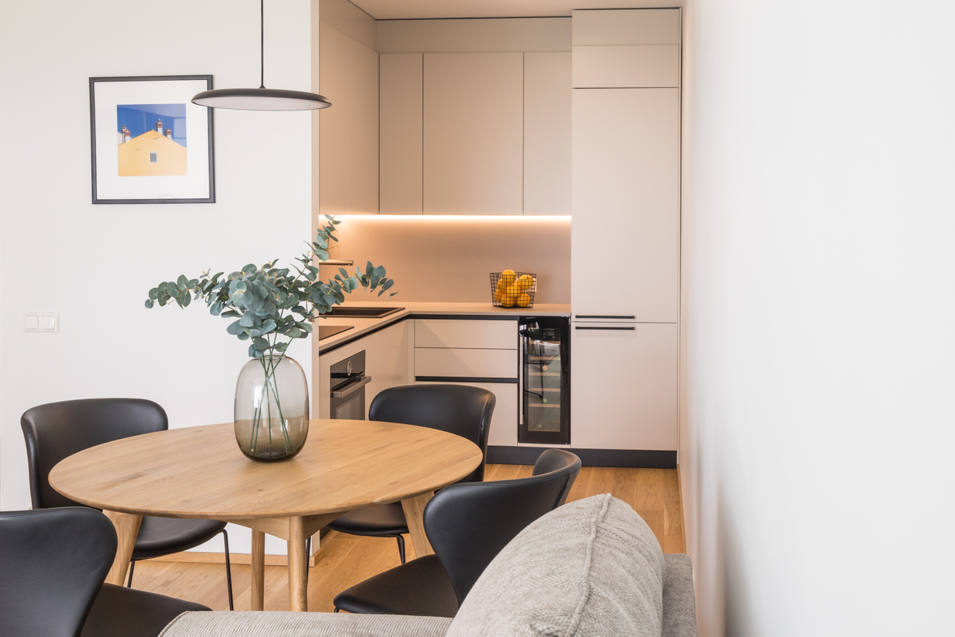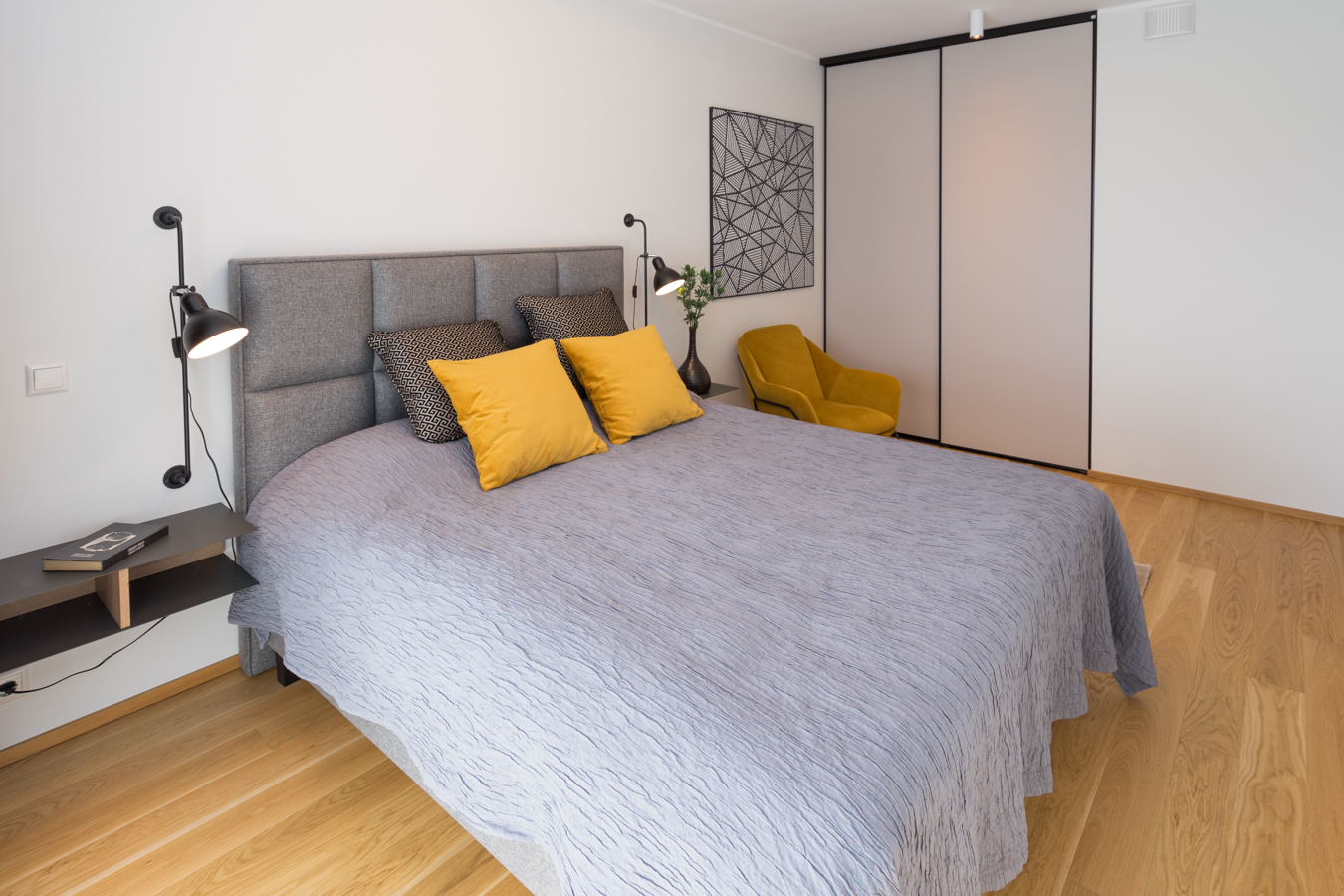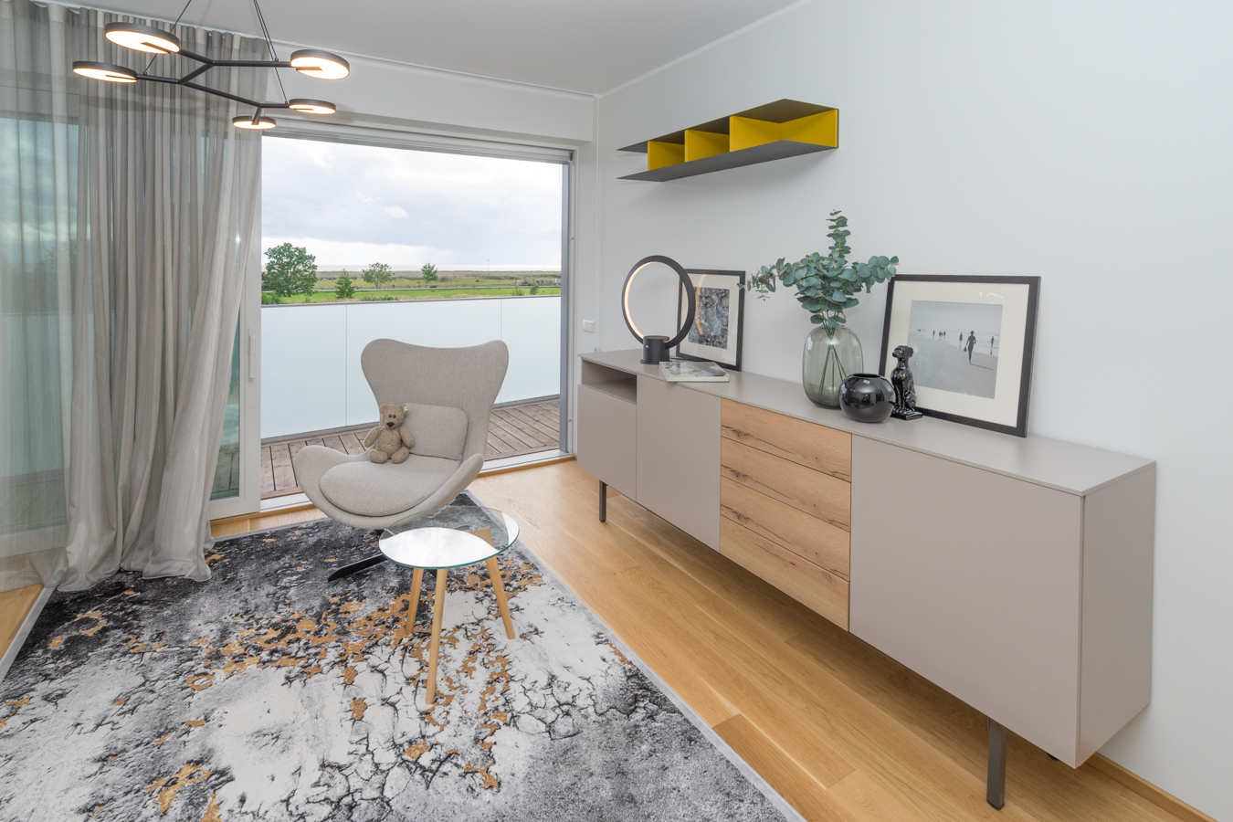 Suvituskoduks soetatud korteris on elutuba/köök, magamistuba ja pesuruum. Disainis jäime suuresti neutraalsete hallide ja puidutoonide juurde, ent aktsendina tõime sisse tumekollase ja musta, inspireerituna rõdul naudingut pakkuvatest päikeseloojangutest ja rannaniidust.
