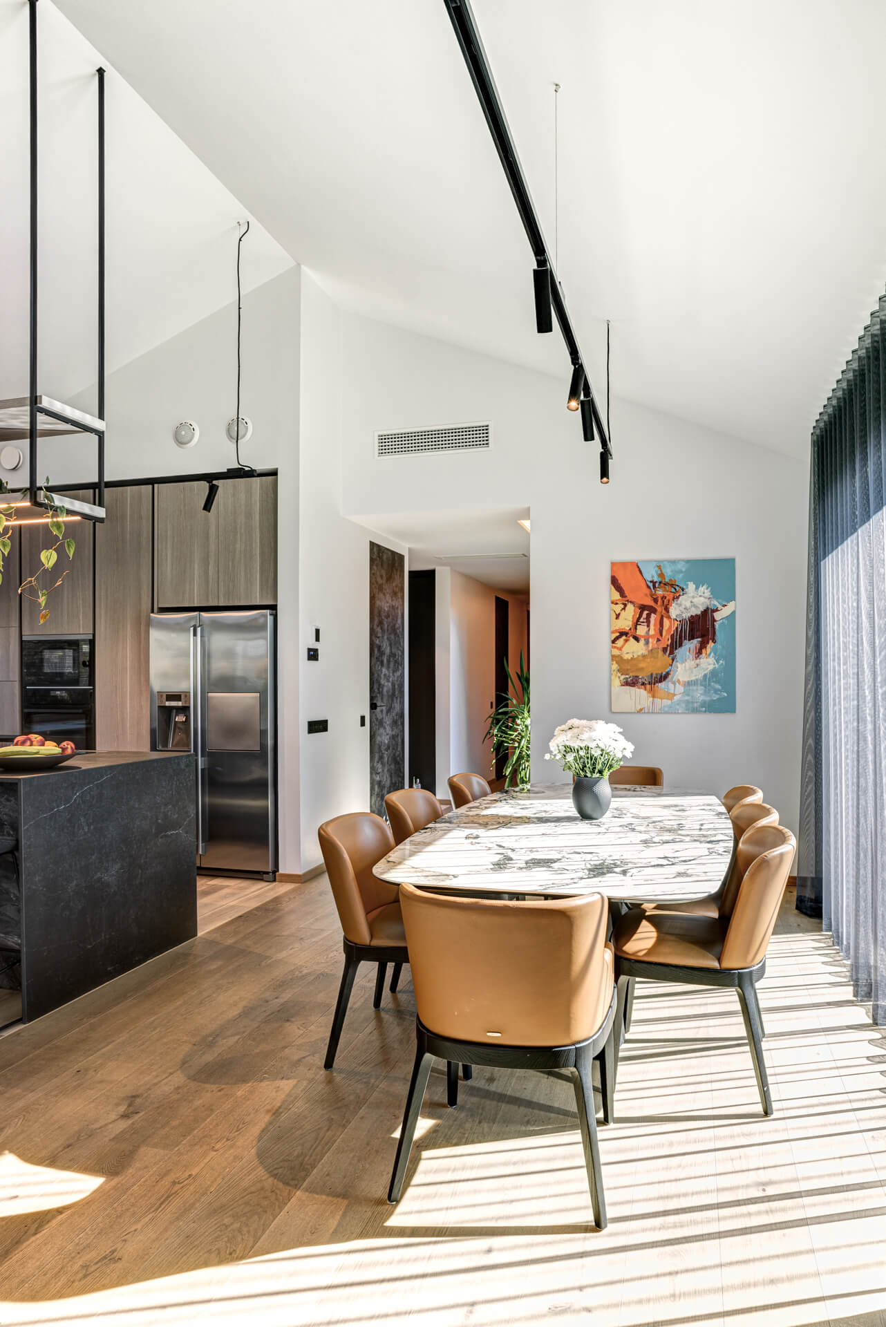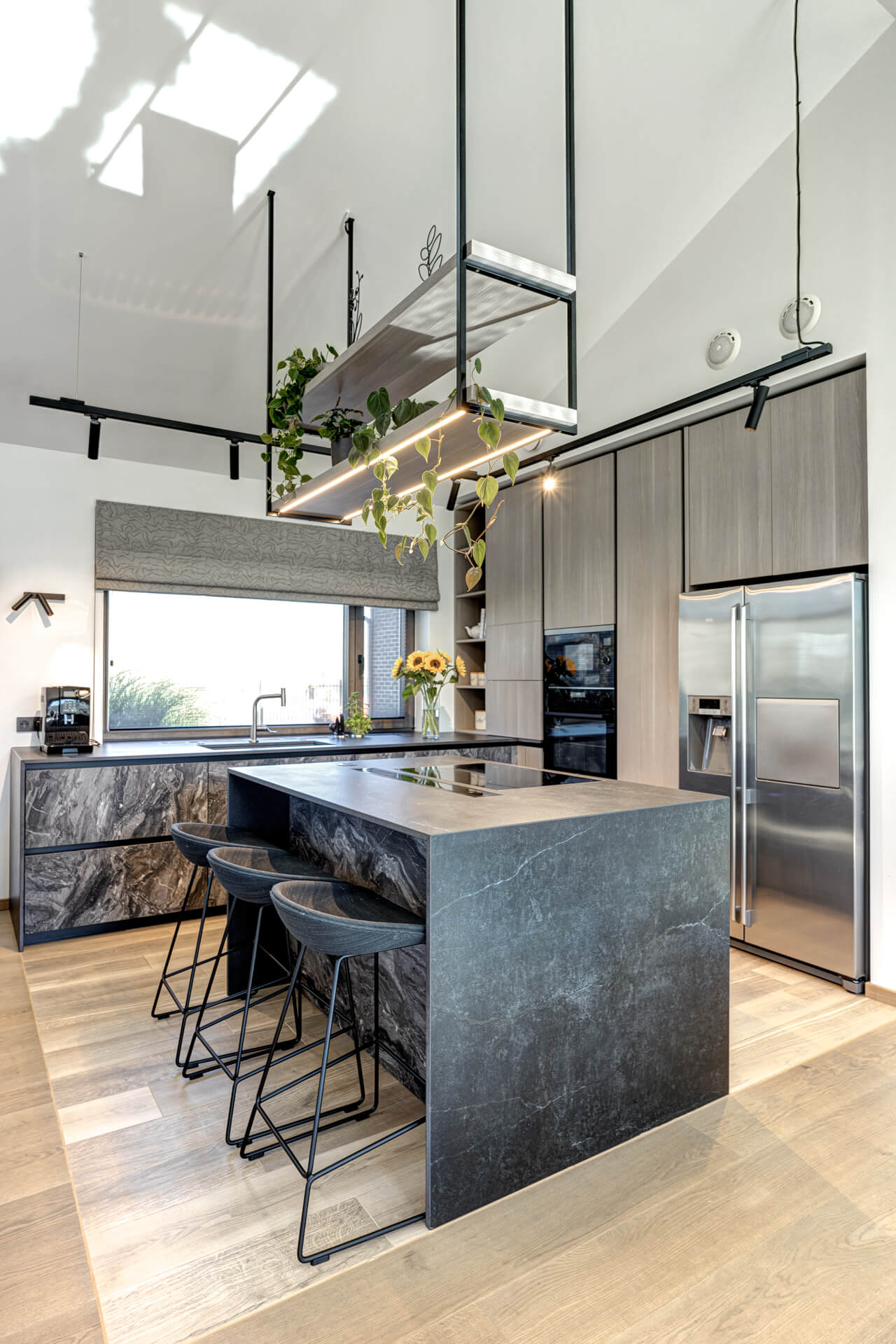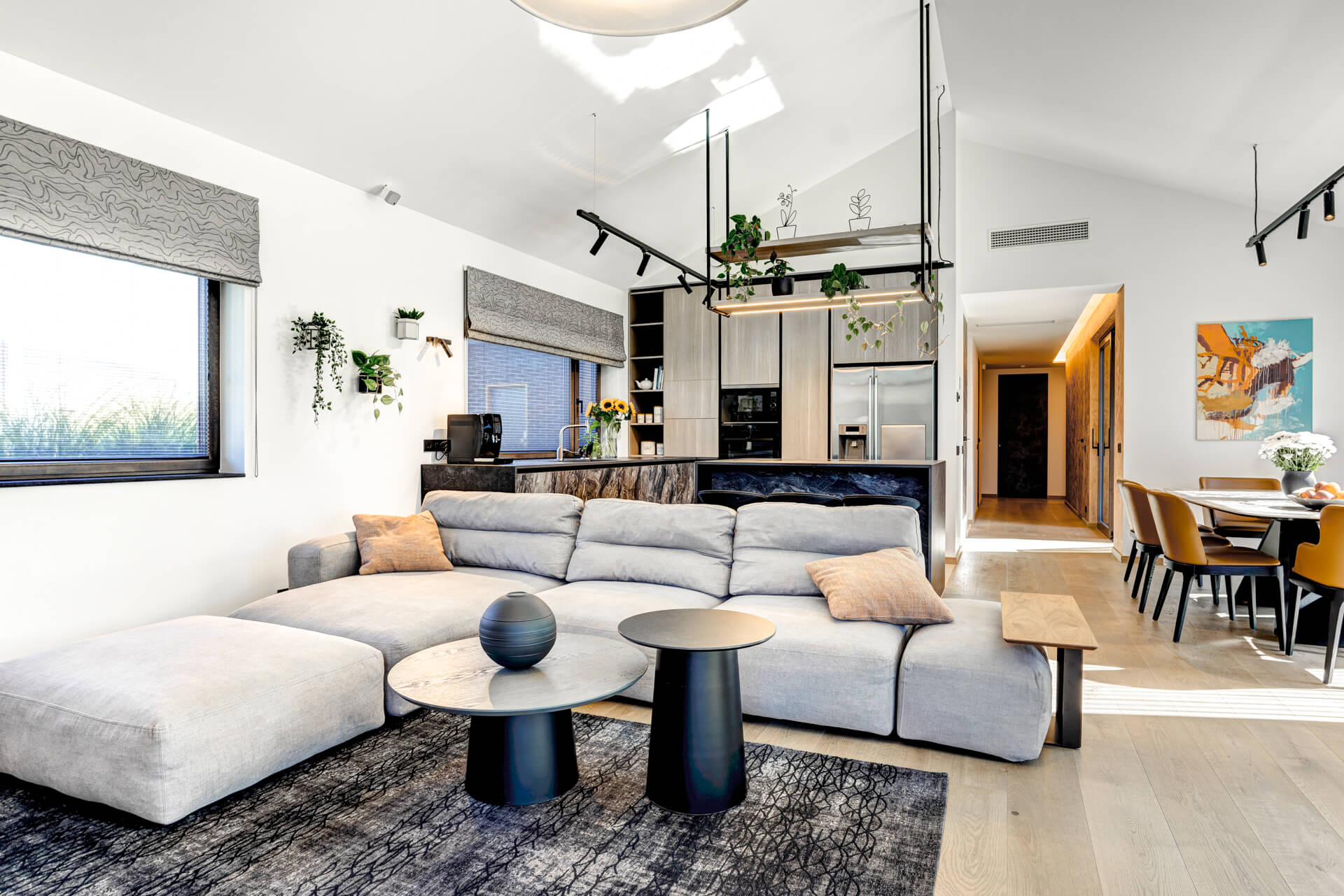 Köök ja elutuba on avatud planeeringuga, kus keskseks elemendiks on suur ja praktiline köögisaar. Kõrge katuslaega ruumi valiti õhupuhastaja, mis on tööpinda integreeritud. Sellega välditi massivset laest rippuvat konstruktsiooni, mille asemele tulid hoopis laest alla rippuvad õhulised, deporatiivsed valgustusega riiulid. See oli üks osa sellesse majja kavandatud ja hoolikalt läbimõeldud valguslahendusest. Elutuppa sai planeeritud rippuvate dekoratiivvalgustite kompositsioon. Köögi osa on valgustatud alla poole toodud siinivalgustitega.