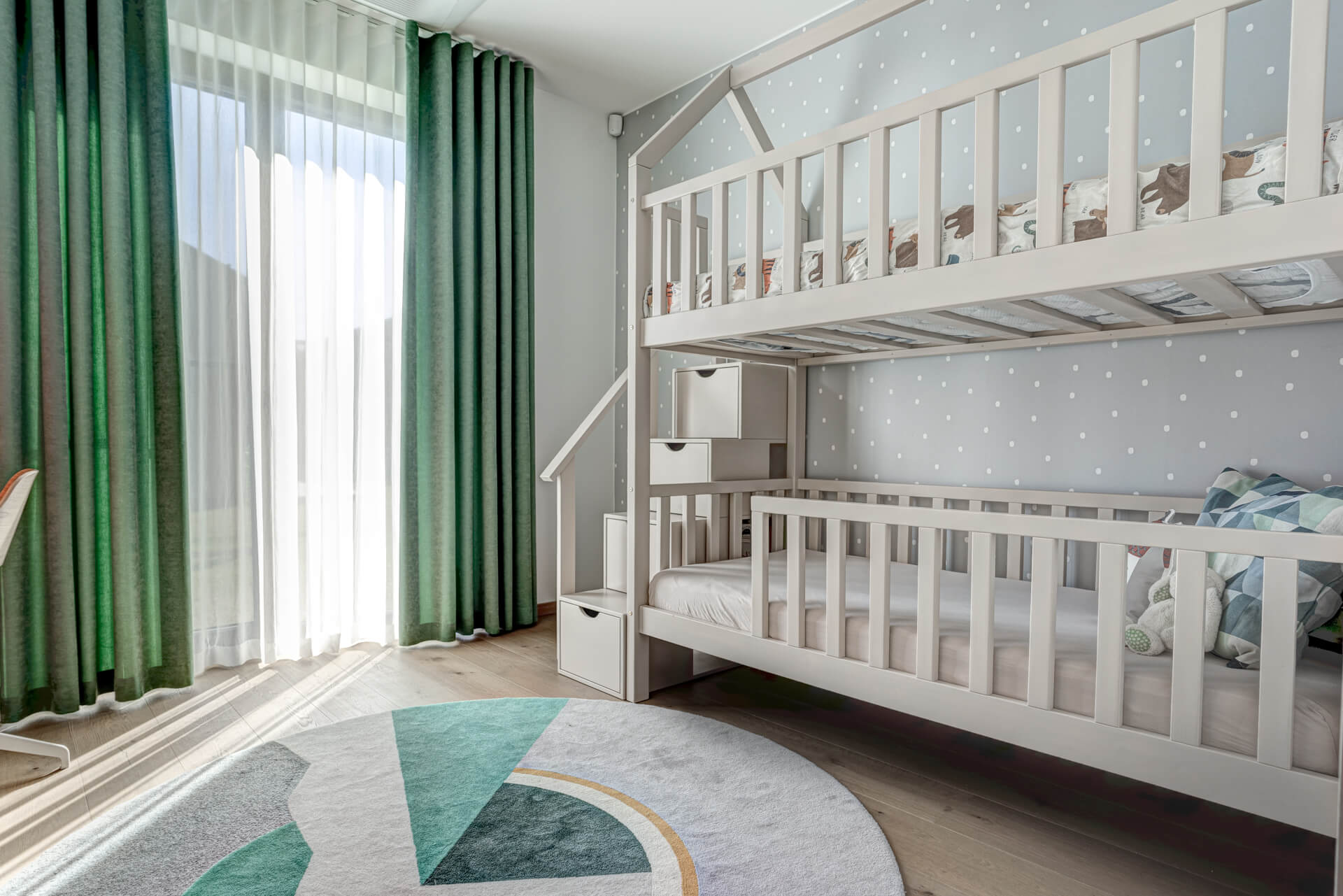 Kodus on kokku kolm lastetuba, mille jaoks valmis eriprojektiga mööbel ja erilised, spetsiaalselt iga toa jaoks disainitud vaibad vastavalt sisekujundustiimi joonistele. Need on kui kirss tordil, ilmestades ja lisades eripära igasse tuppa.