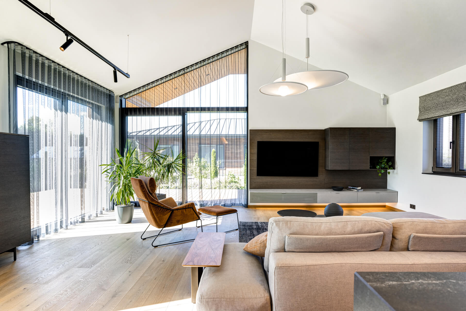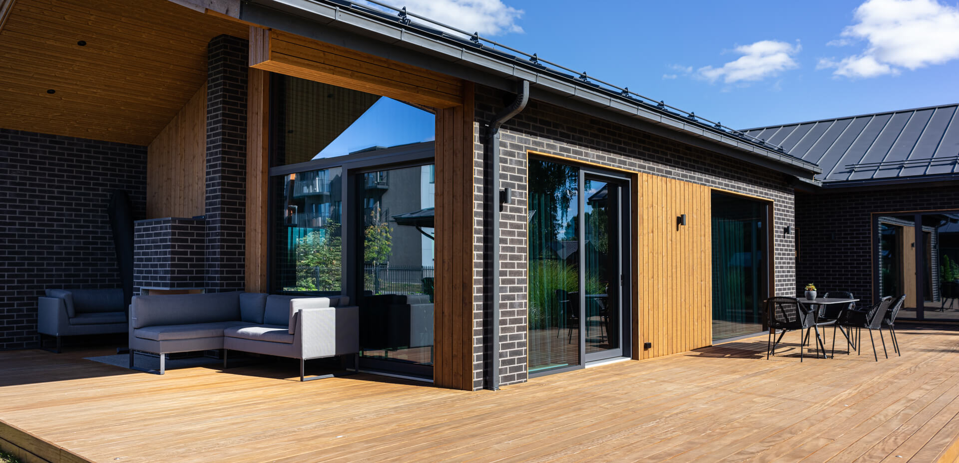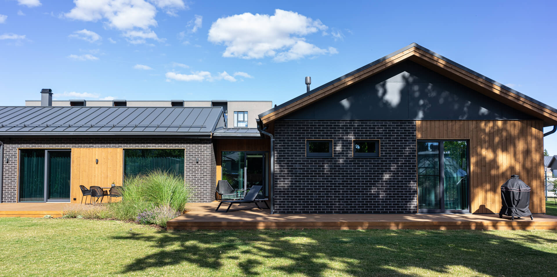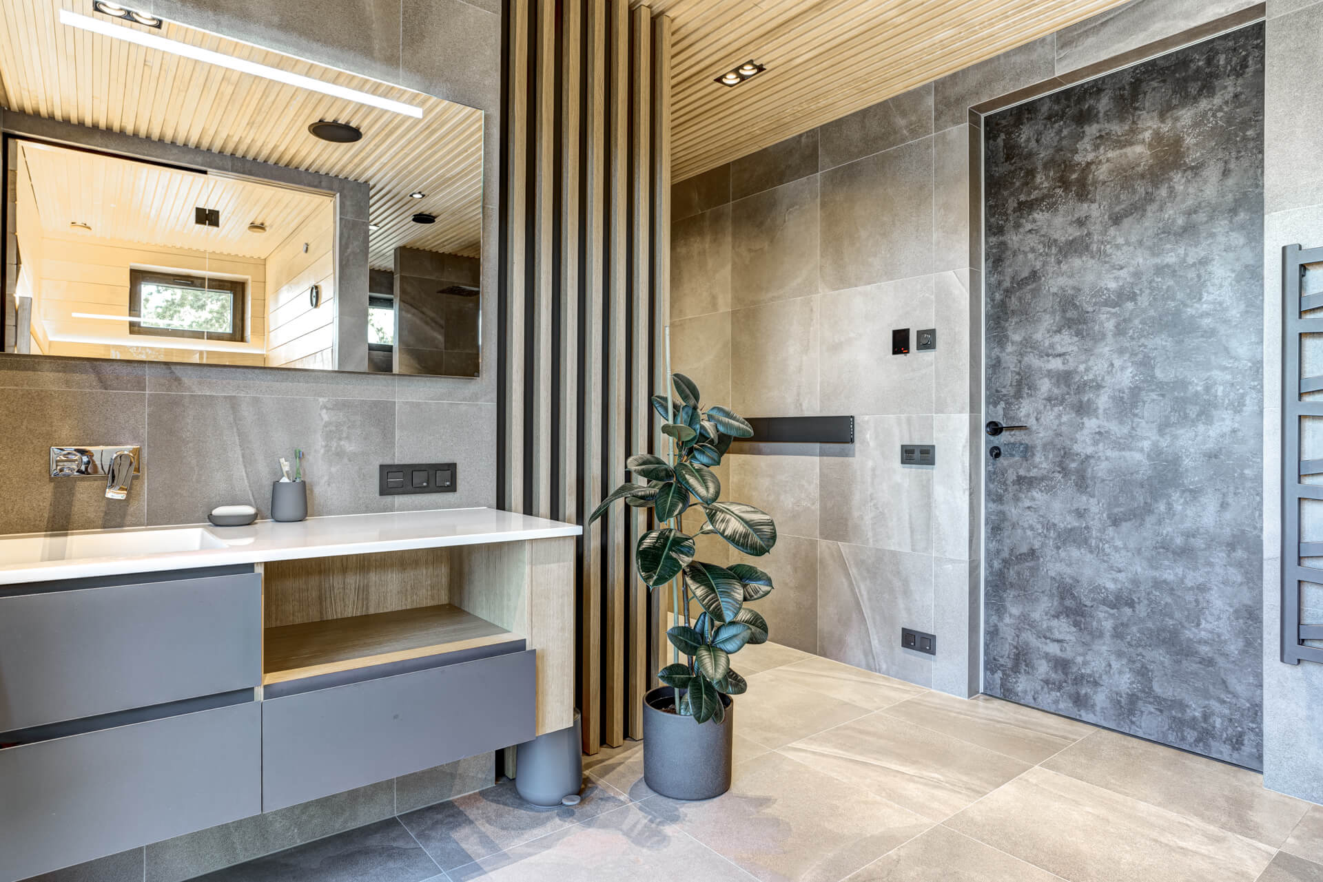 Sauna-, majapidamis- ja pesuruum on hubane ala, kus kogu pere saab korraga tegeleda erinevate tegevustega ilma järjekorras ootamata. Leiliruumist läbi klaasseina avaneb vaade terrassile. Sauna eridisainis on astmed ja lava joonistatud veidi nurga alla.