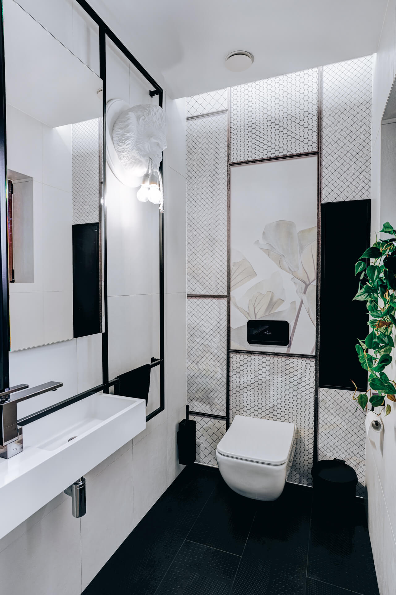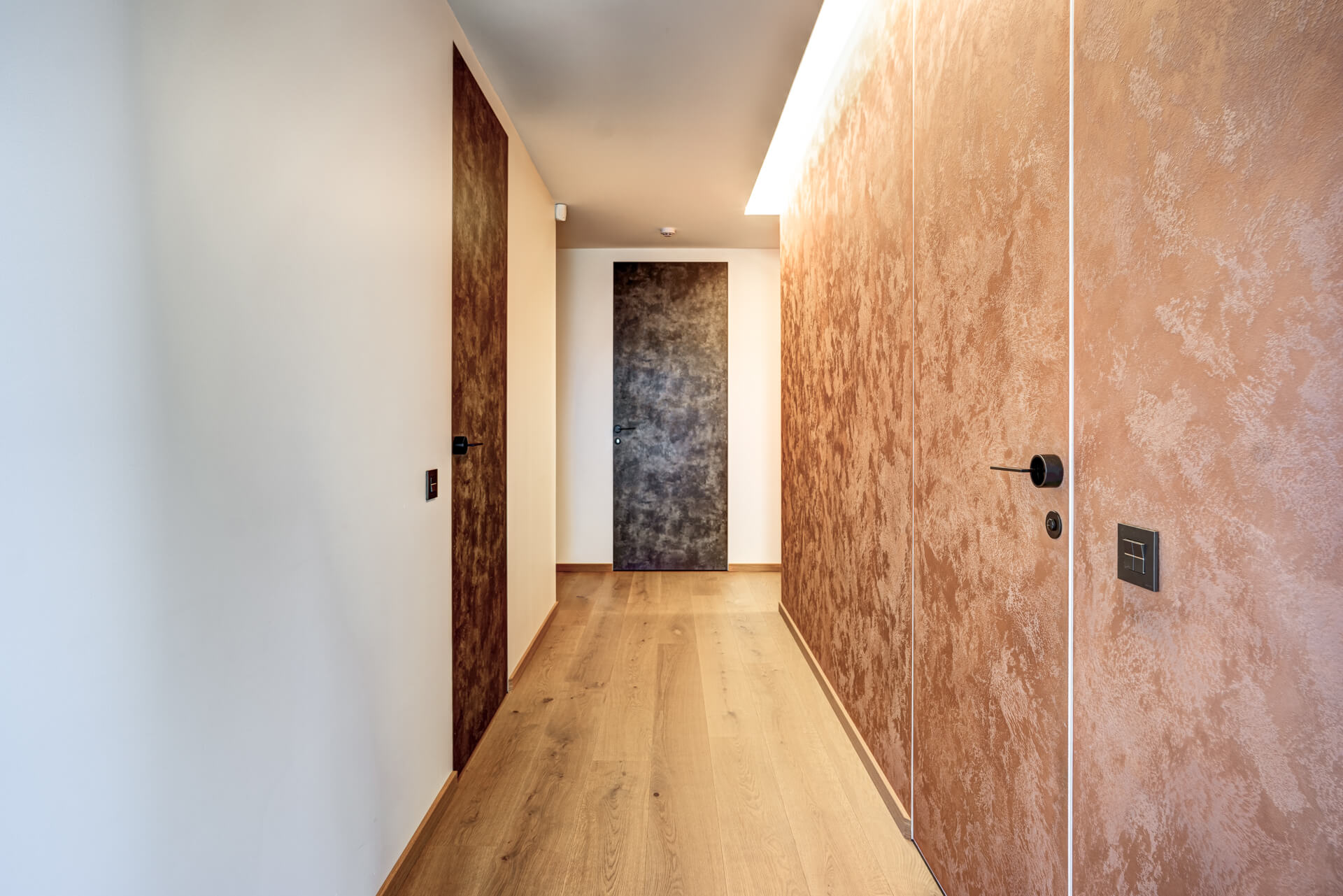 Koridoris on nähtamatud lengideta uksed. Ühes seinas said need viimistletud dekoratiivvärviga. Väikese WC muutsid isikupäraseks dekoratiivne Karmani Gorilla lamp ning komposiidist valmistatud eritellimusvalamu.
