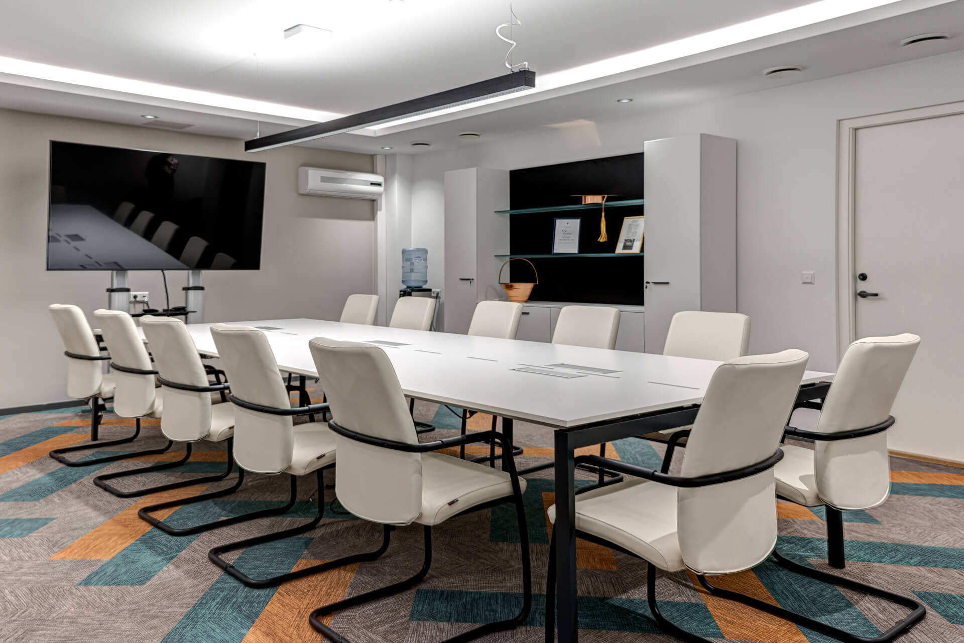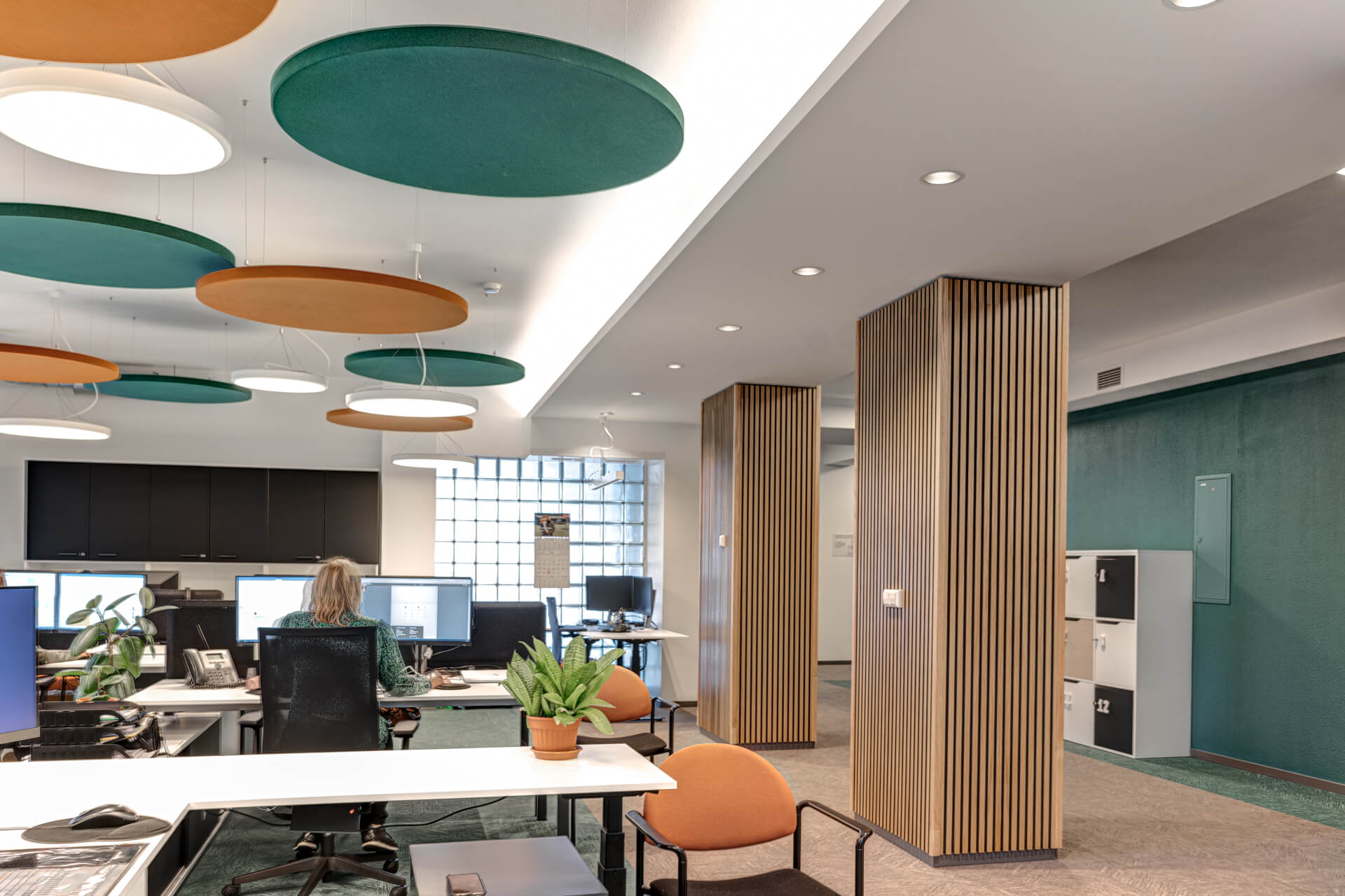 Vaipade värvidest inspireerituna kasutasime avaliku tööala akustika tasakaalustamiseks lakke riputatavaid värvilisi akustilisi paneele. Need ümmargused paneelid moodustasid ümmarguste rippvalgustitega koos mängulise disainkompositsiooni. Lisaks viimistlesime ruumi toestuspostid viimistleti akustiliste ribipaneelidega.