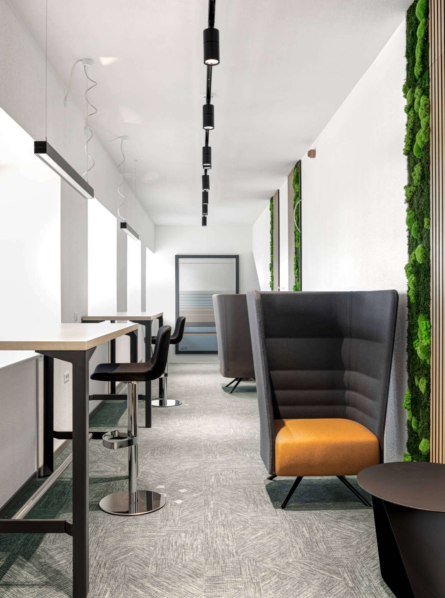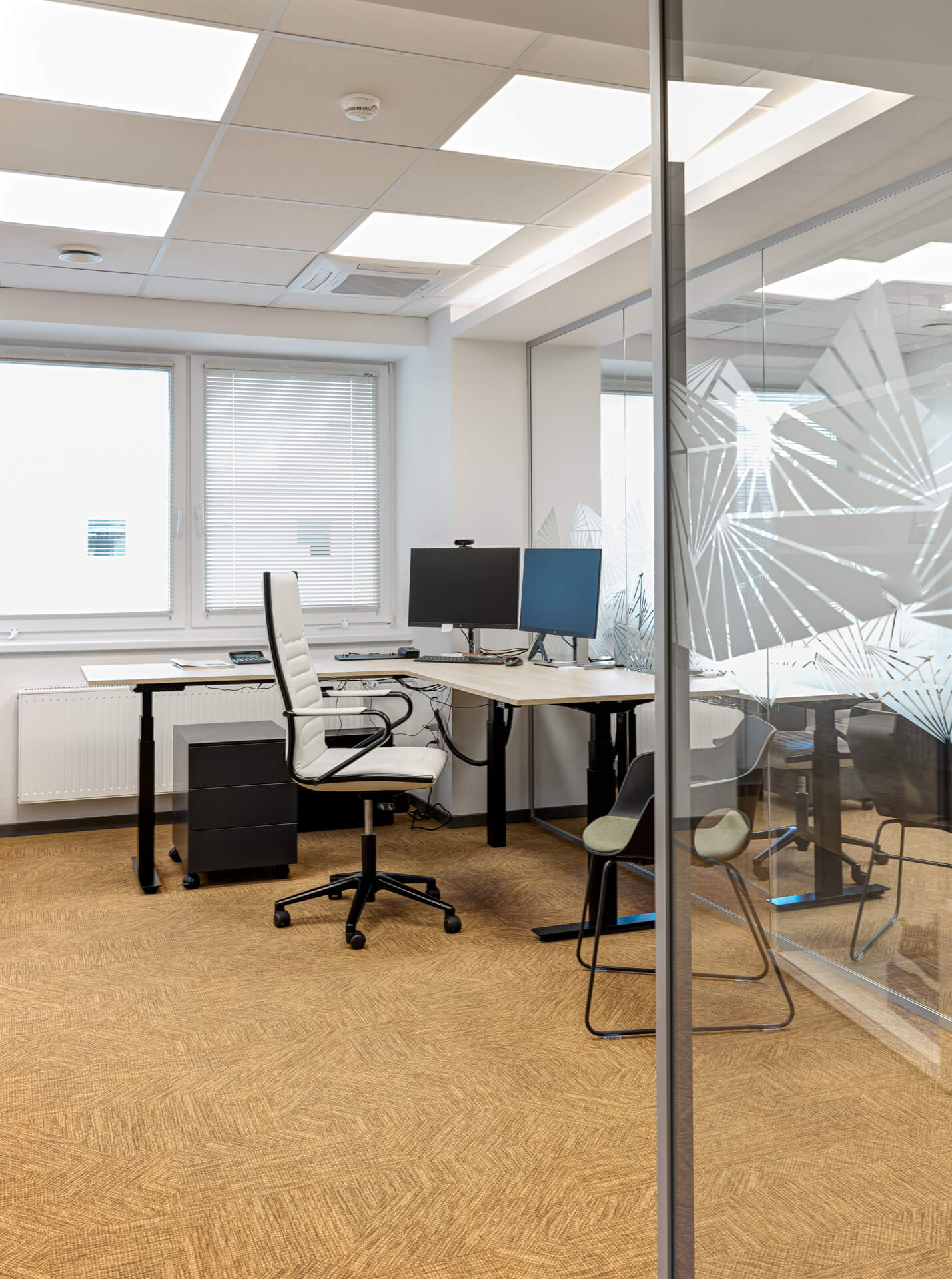 Integreerisime kontori töökeskkonda mitmeid tänapäevaseid kontori- ja mööblilahendusi. Kliendi soovil valisime töölaudadeks elektrilised tõstuklauad, et inimesed saaksid teha vaheldust istuva ja seisva asendi vahel – nii ei jää tööpäeva lõpuks selg ja jalad kangeks. Koridoris leidis koha akustiliselt eraldatud kõneboks neile, kellel on vaja tihti kõnesid teha.