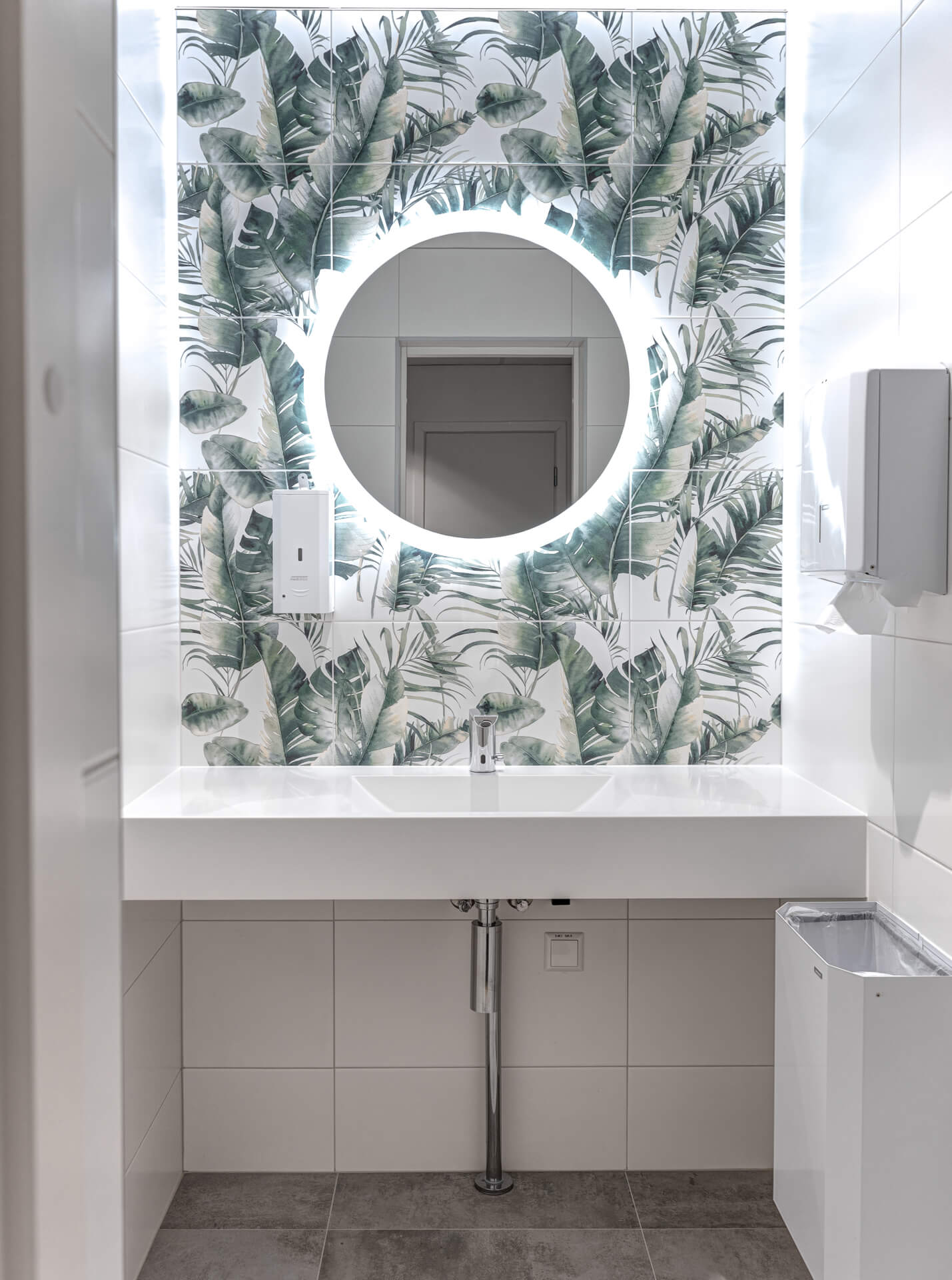 Kuna kliendi soov oli tuua väljast tuppa ka looduse temaatikat, kasutasime galeriis ja väikeses nõupidamisteruumis samblapaneele vaheldumisi akustiliste ribapaneelidega. Lisasime looduse motiive ka kõigisse renoveeritud tualettruumidesse.