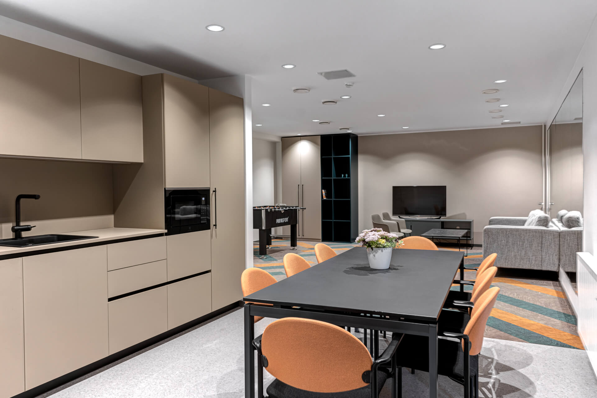 Tihti käivad kontoris töötavad inimesed lõunapausi ajal kohvikus, vahel saab ju kliendikohtumisigi lõunasöögiga koos teha. Meie kliendi kontor asub aga kesklinnast eemal, kus söögikohad jäävad kaugele ning seega võtavad inimesed toidu tööle kaasa. Meie ülesanne oli luua avar puhkeruum, kus lisaks lõunatamisele saab lihtsalt teha pausi, kolleegidega jutustada või lauajalgpalli mängida. Toreda lisana oli selles kontoris ka töötajatele mõeldud saunaruumid, mis said uuendatud.