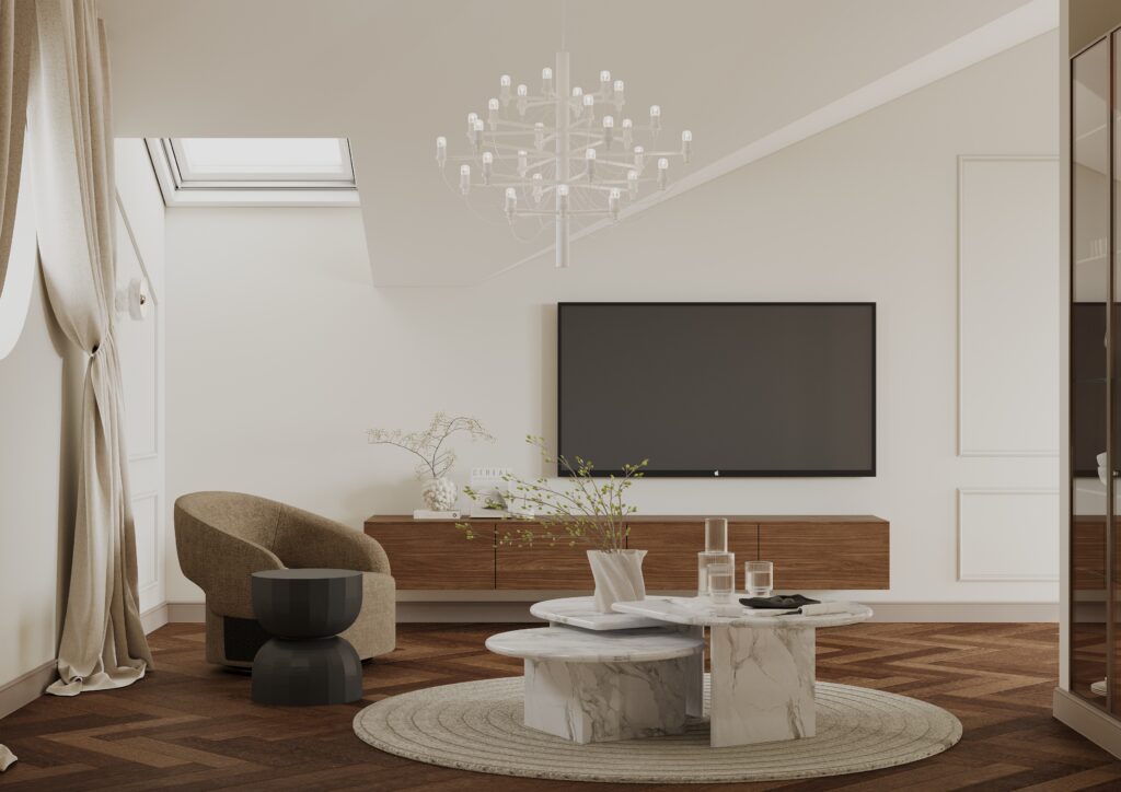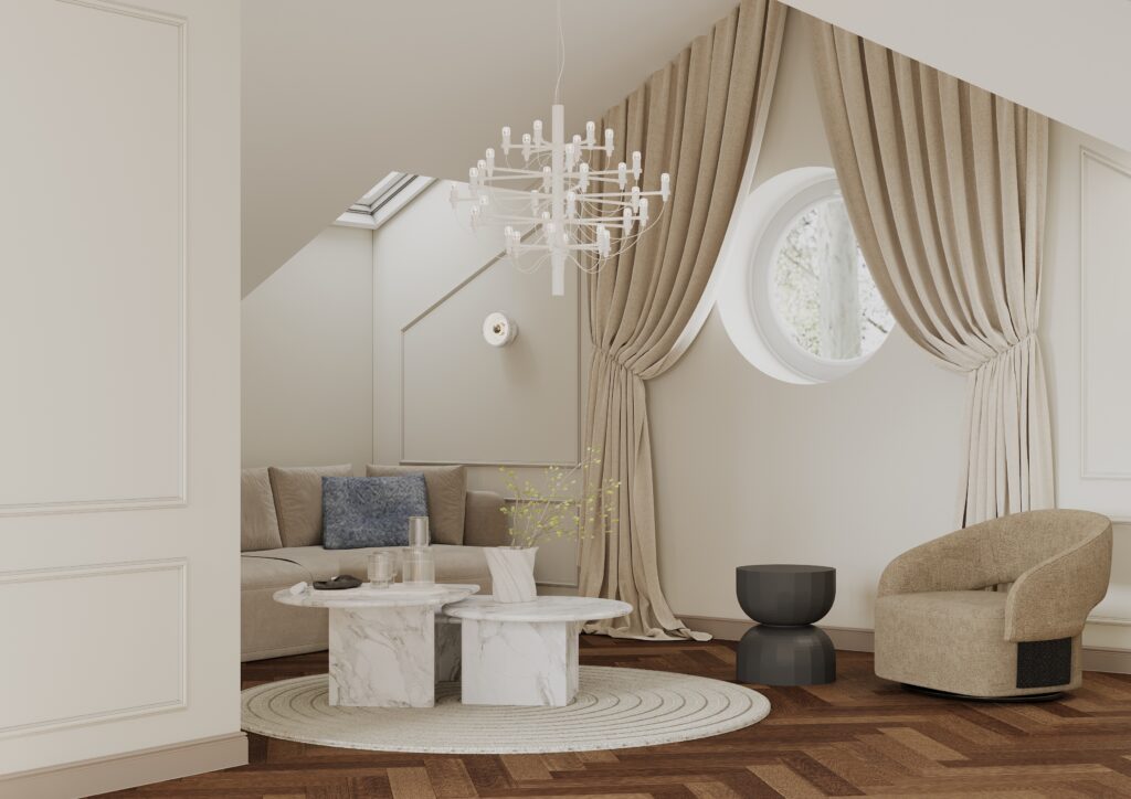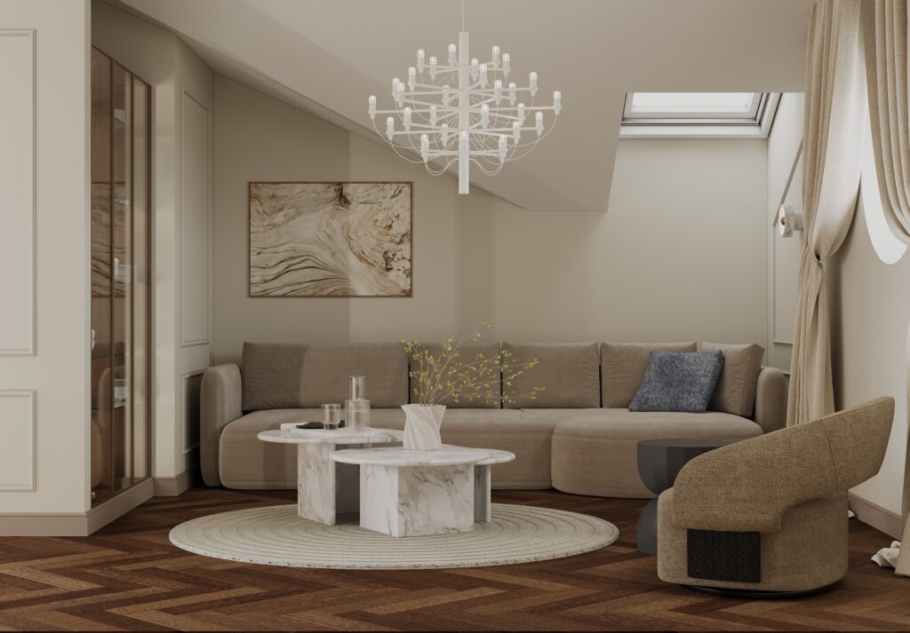 Elutoa poolel lisavad ruumile vormi ja pehmust ümar vaip ning kihilised marmorist kohvilauad. Neutraalne diivan ja ümardatud vormidega tugitoolid loovad mugava, rahuliku istumisala. Valgustid on pigem ruumi ehe, õhulised ja graafilised, kuid mitte domineerivad. Klaasustega vitriinkapp toob puidu ja valguse kaudu soojust ning lisab elualale kodust väärikust.