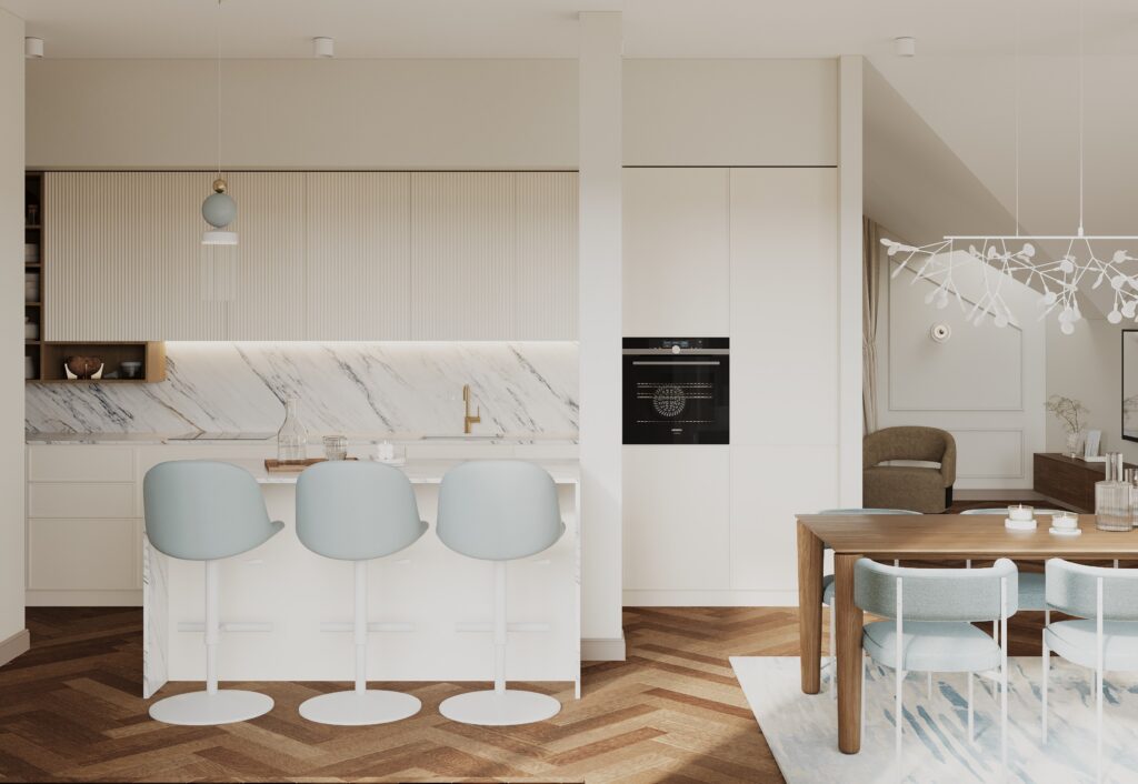 Kodu keskpunkt on avatud eluala, kus köök, söögikoht ja elutuba on seotud üheks tervikuks. Köögimööblis kasutasime peene raamiga uksi ja hoidsime kogu kompositsiooni puhta ning selge joonega. Kõik metalldetailid, mis sageli kipuvad olema pronksi või kroomi toonis, värvisime selles projektis valgeks, et ruum oleks veel heledam ja helgem.