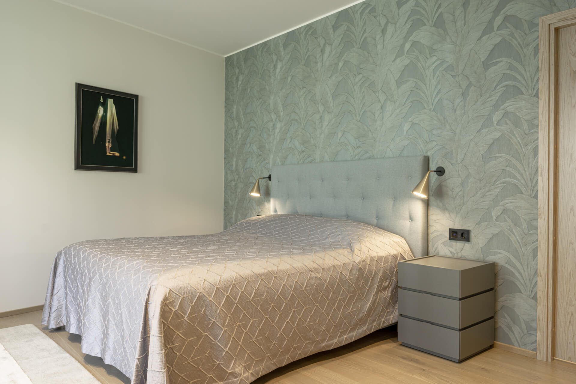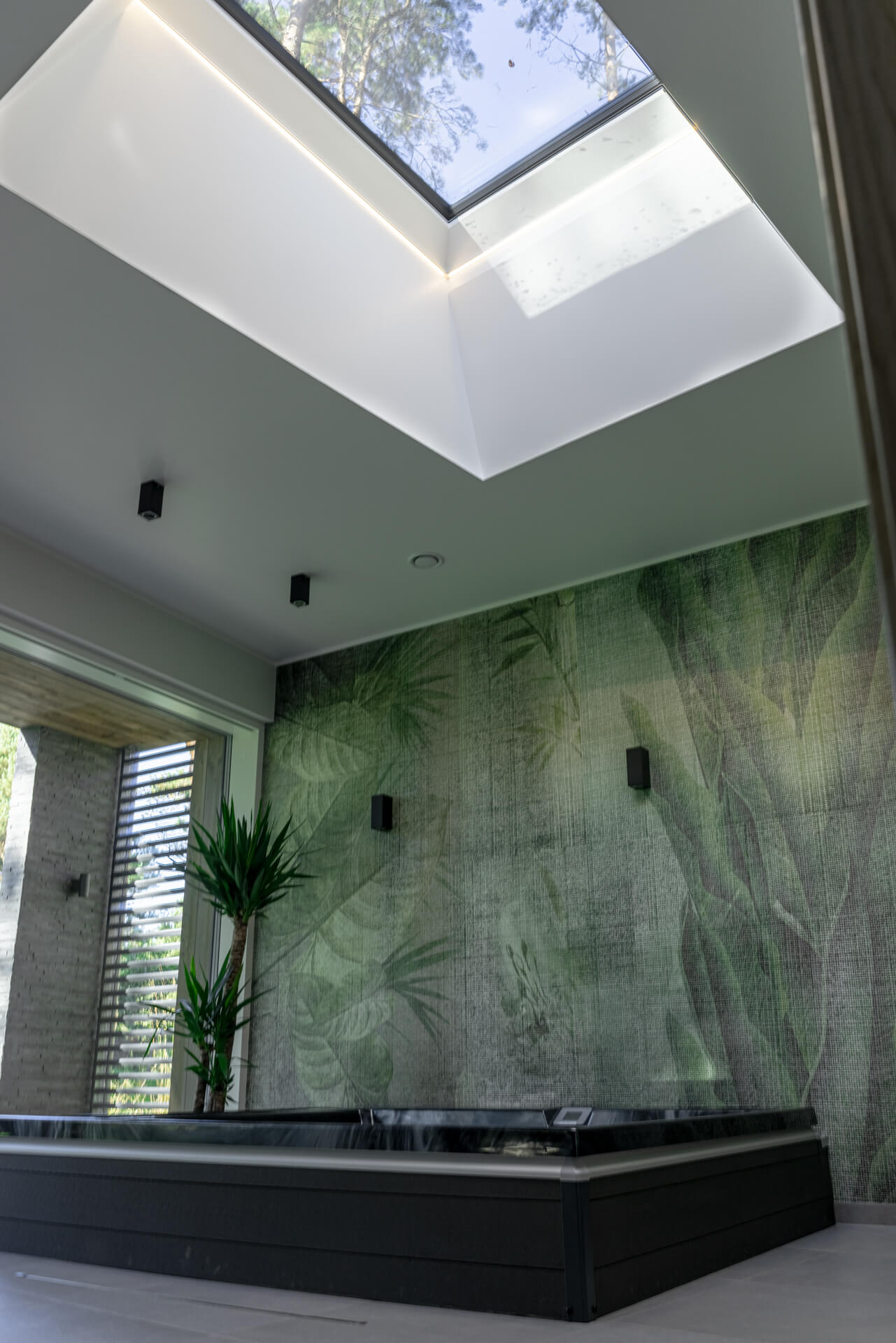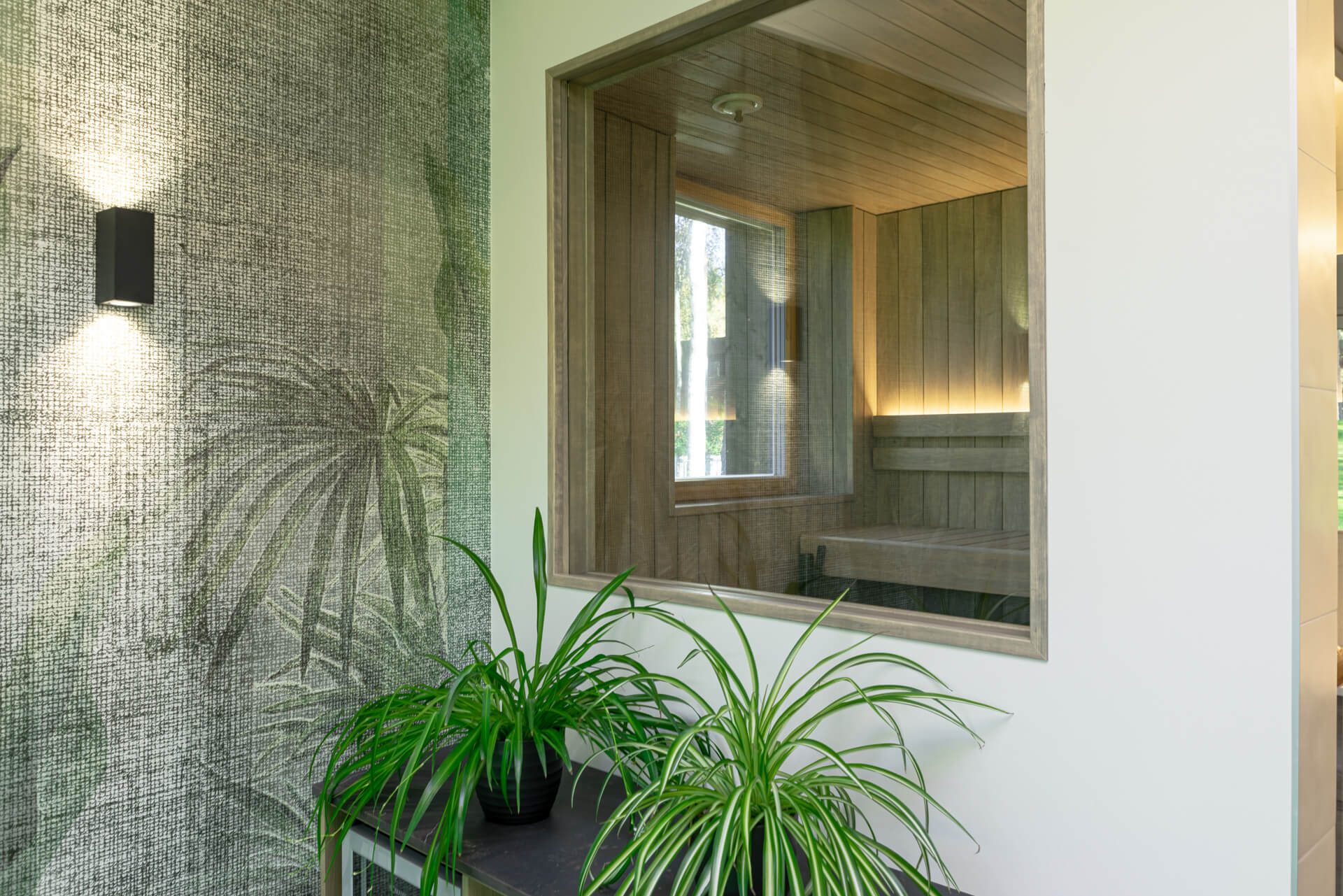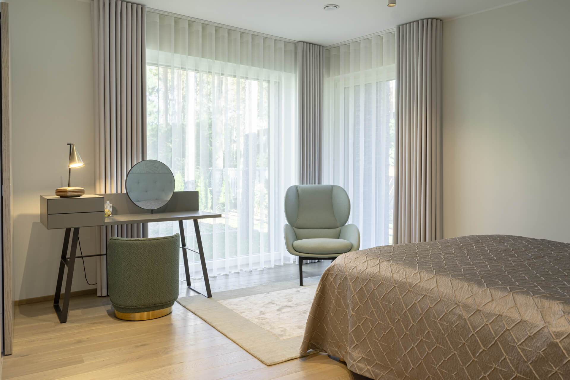Lisaks hallikatele põhitoonidele kasutasime ka rohelist ja sinist, mis esinevad nii pesuruumides kui ka magamistubades. Ruume ühendav viimistluspindade materjal on hall tamm. Roheluse teema jätkamiseks tõime viimistlusmaterjalidena sisse taimemotiividega keraamilised vannitoaplaadid, veekindla tapeedi SPA-s ning tapeedid magamistubades. Elegantsust ja hubasust lisavad interjöörile hoolikalt valitud kardinad ja vaibad.