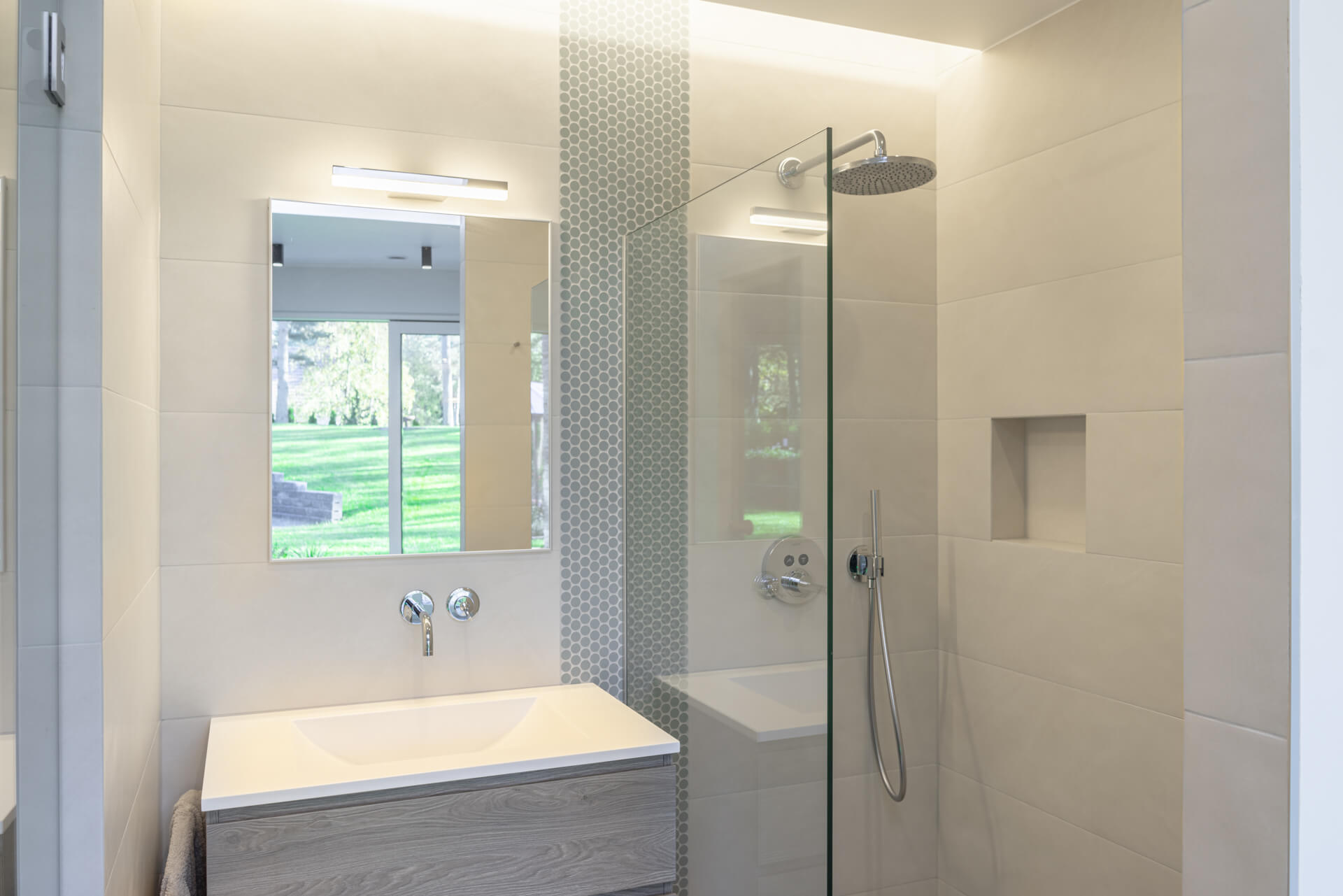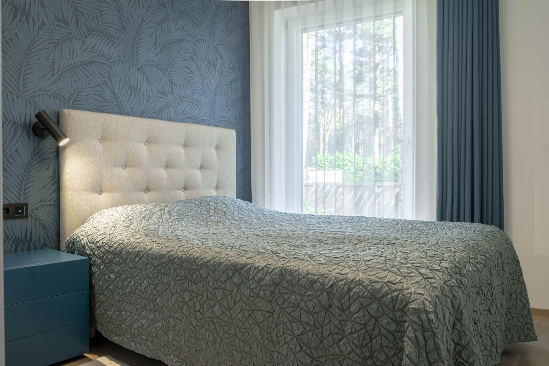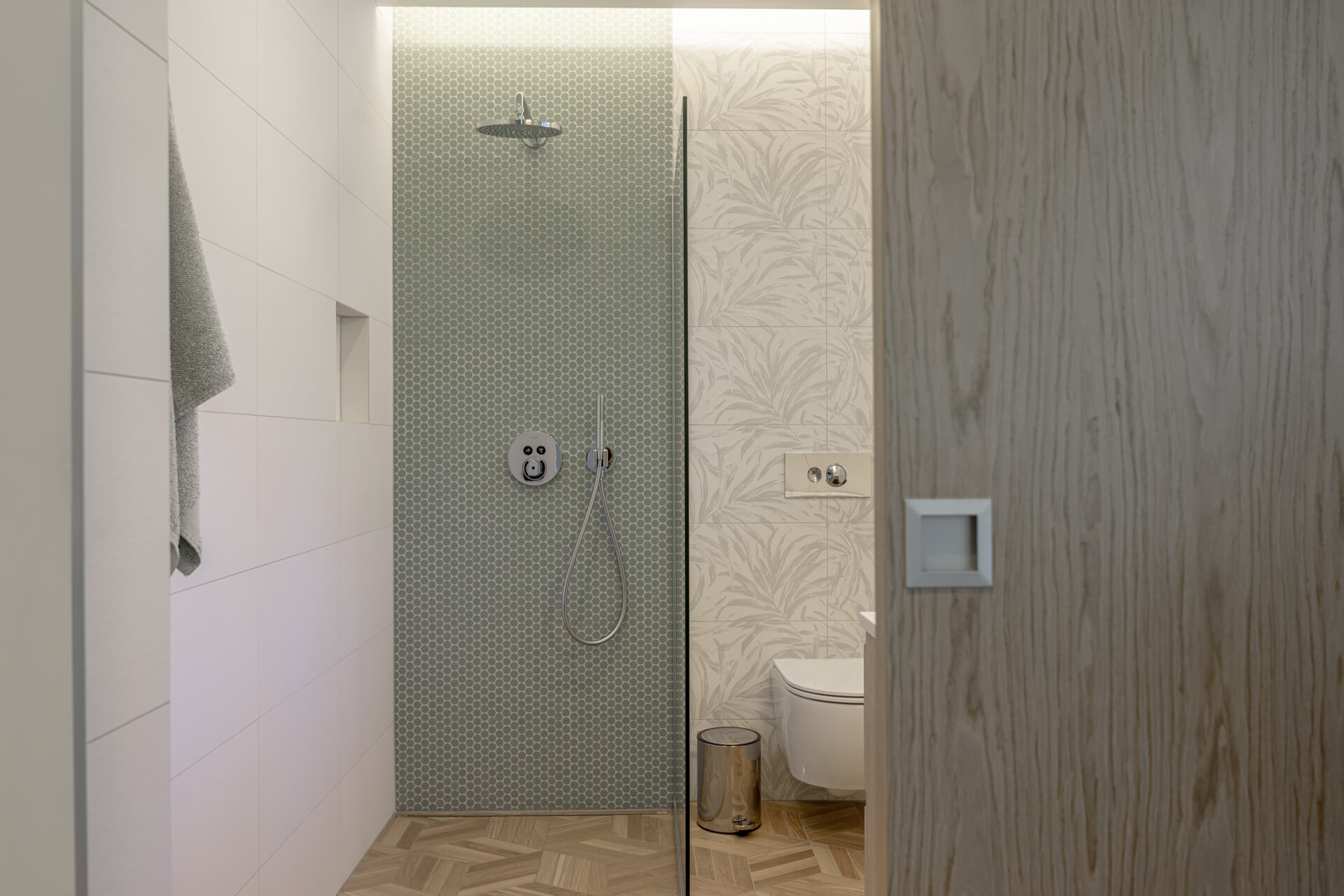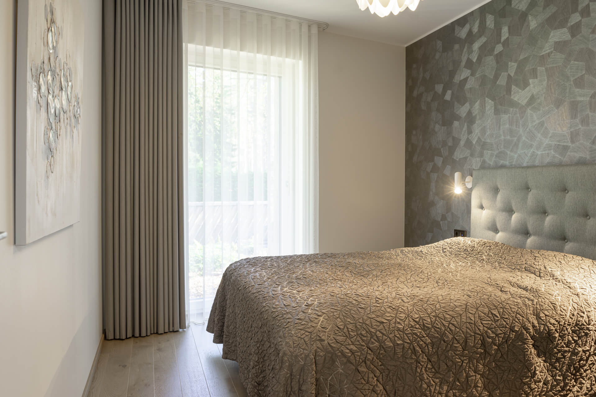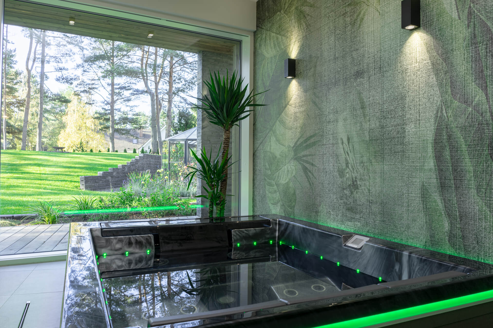 Lisaks hallikatele põhitoonidele kasutasime ka rohelist ja sinist, mis esinevad nii pesuruumides kui ka magamistubades. Ruume ühendav viimistluspindade materjal on hall tamm. Roheluse teema jätkamiseks tõime viimistlusmaterjalidena sisse taimemotiividega keraamilised vannitoaplaadid, veekindla tapeedi SPA-s ning tapeedid magamistubades. Elegantsust ja hubasust lisavad interjöörile hoolikalt valitud kardinad ja vaibad.