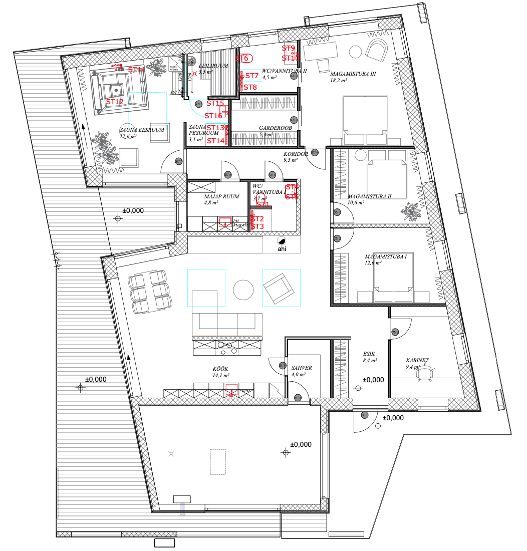 Majas on lisaks köögile ja elutoale ka 3 magamistuba, kabinet, 2 pesuruumi, saun ja basseini ruum.Kuna pere lapsed on juba täiskasvanud siis lastetubade asemel kujundasime hoopis 2 väikest külalistetuba.
