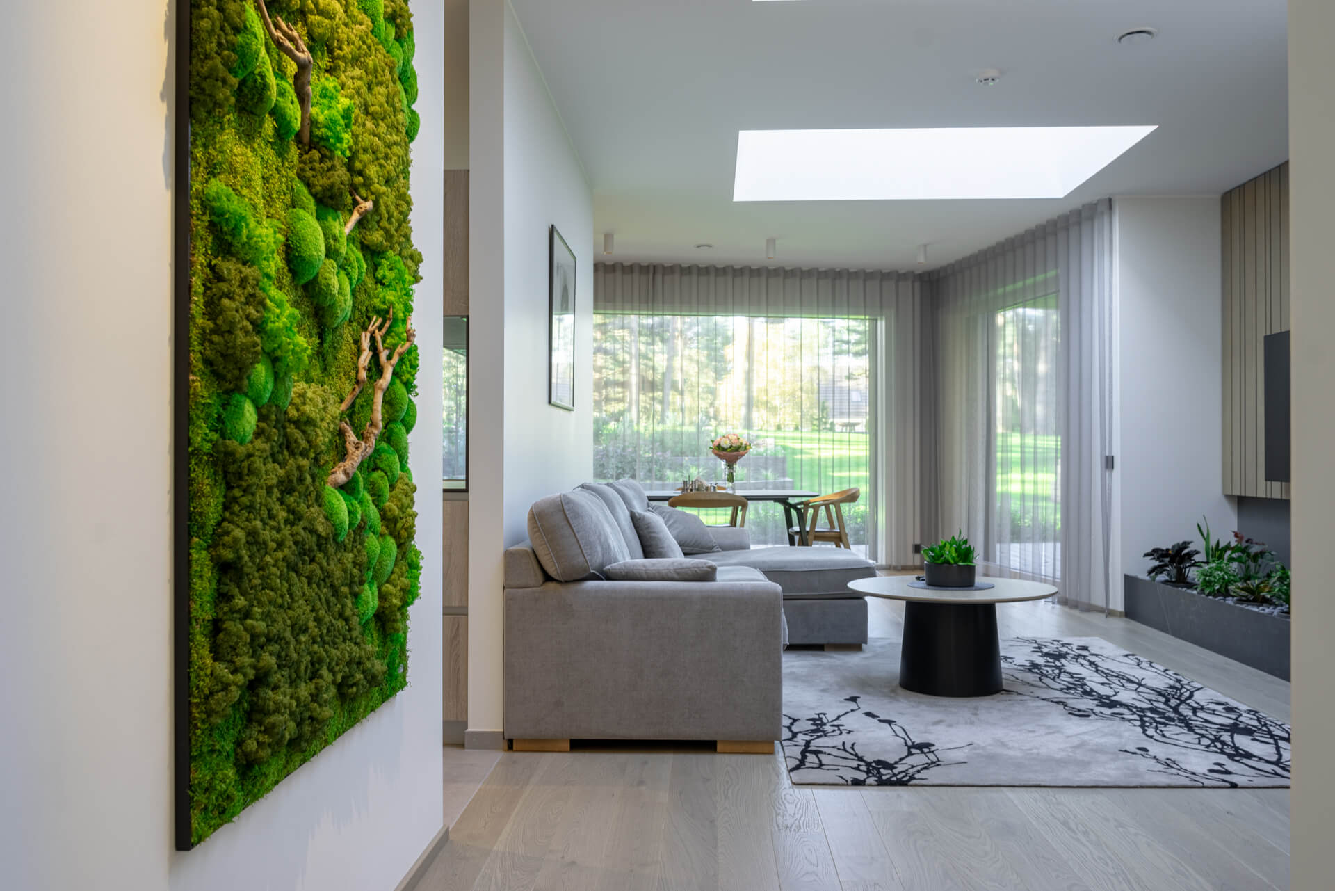 Objektiks oli looduse keskel asuv eramu Pirita kaunite mändide all. Seega interjööri üldkontseptsiooni ja meeleolu valikul oli rõhk loodusel ja rohelusel. Selleks kasutasime nii looduslähedasi värvitoone, erinevaid naturaalseid viimistlusmaterjale kui ka dekoratiivseid taimi. Lisaks akendest paistvale kaunile loodusele toovad seda tuppa ka suured katuseaknad elutoas ja SPA-s.