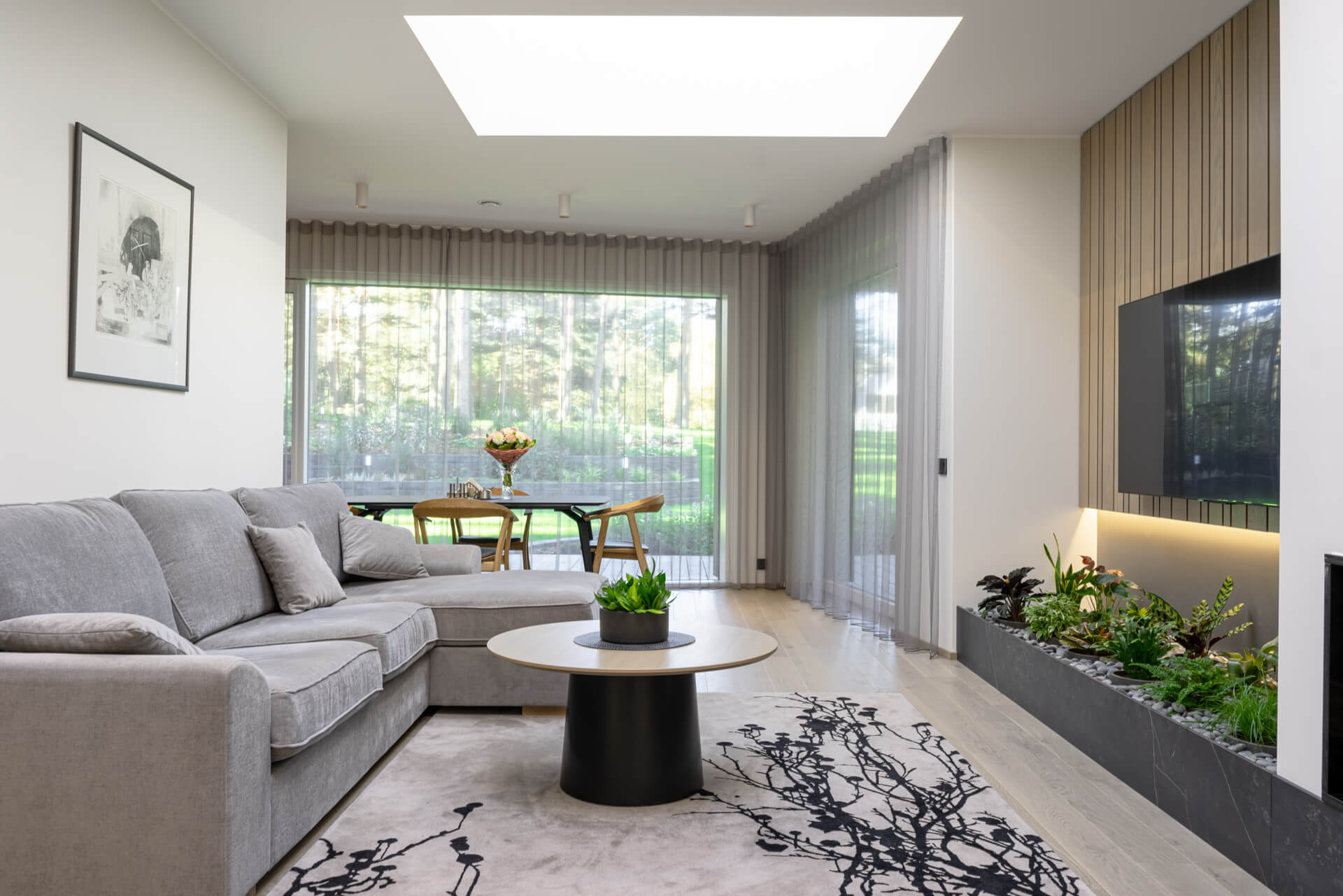 Elutuba on eraldatud köögist vaheseinaga. Seda nii selleks, et eraldada kogu toiduvalmistamise melu mõnusast lõõgastumiskohast kui ka toidulõhnade levimise takistamiseks. Elutoa suurtest maast laeni akendest avaneb vaade imelisele õuealale. Selle vaate ühiseks nautimiseks paigutasime akna ette pikendatava söögilaua. Et laua pikendamisel ja nihutamisel ebamugavusi vältida, jätsime elutoa interjöörist välja suuremad rippuvad dekoratiivsed valgustid.